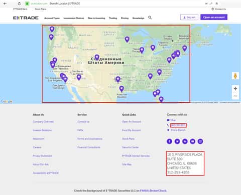 Что же по поводу контактов, то тут у шулеров E-trade полное изобилие. У них есть офисы в многих штатах США. Это, однако, как мы видим, не спасает их клиентов от непрофессионализма и ужасных условий трейдинга, приводящих к огромным убыткам для многих пользователей Сети. Контакты, данные на сайте Е трейд, будут представлены ниже: