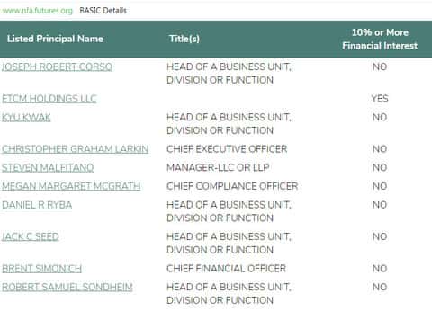 Что по поводу руководства, то на самом сайте Е трейд о нём данных нет. Чтобы узнать данные о руководстве данной конторы нужно воспользоваться поиском по одному из регуляторов, у которых зарегистрированы E-trade. Таким образом мы может увидеть главный список представителей данной конторы, которые мы приведём ниже:
