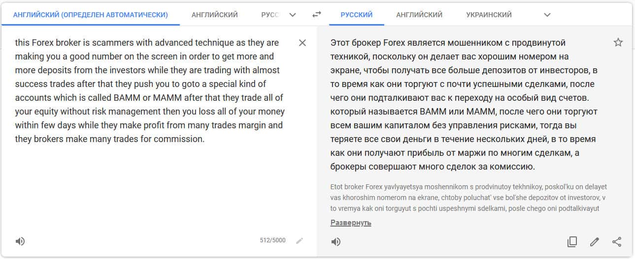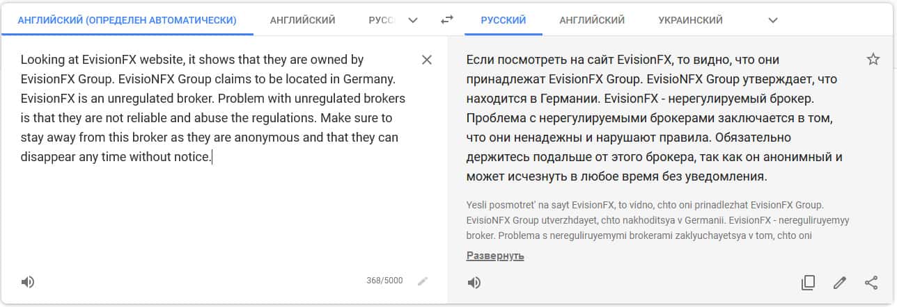 перевод отзыва о Эвижин ФХ на сайте translate.google com