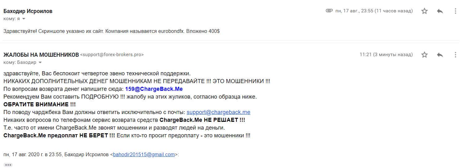 В том случае если мошенники из Евро Бонд ФХ и Вас обворовали, то в таком случае обязательно напишите об этом случае нам. Сообщите адрес электронной почты в форме связи чуть ниже, и тогда с Вами установят контакт.