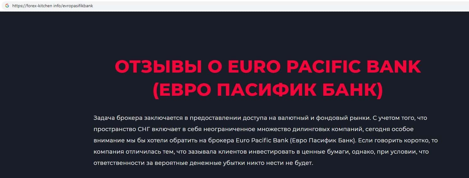 Вероятно скам-брокер Евро Пасифик Банк подчищает негативную информацию о компании, поскольку во всемирной паутине найден лишь один отзыв о том, что перед нами кухня.