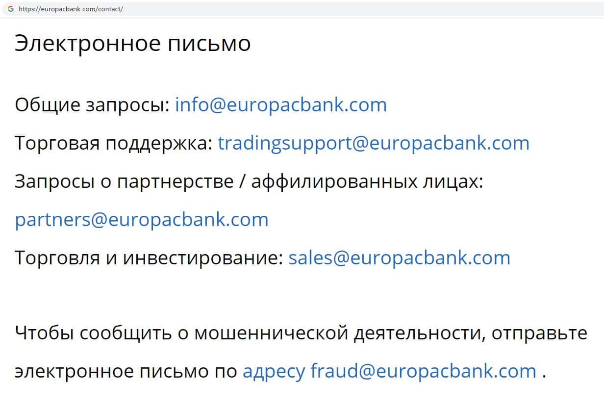 Лохотронщики Euro Pacific Bank на своем официальном интернет-ресурсе указывают несколько адресов электронной почты, а именно: