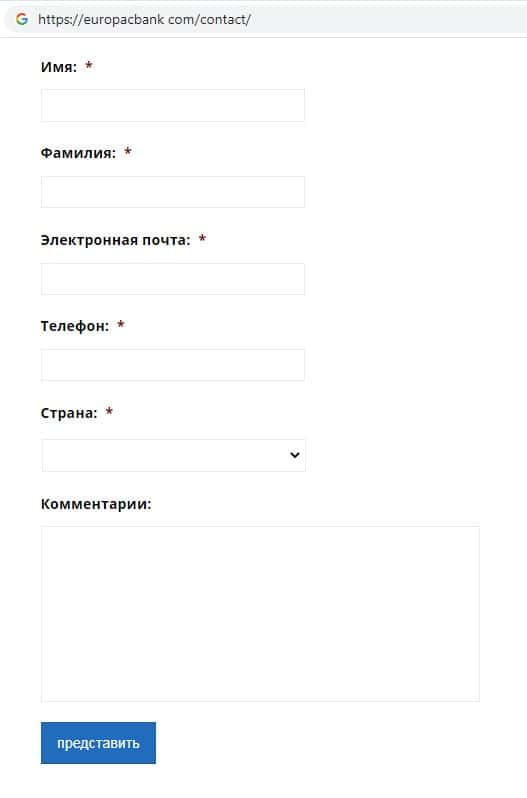 Обманщики Euro Pacific Bank предлагают пользователям заполнить бланк обратной связи, где просят указать свое имя, фамилию, адрес электронной почты и номер телефона.