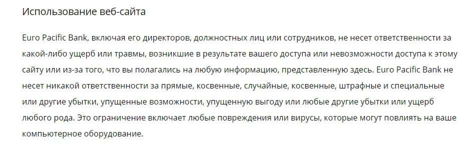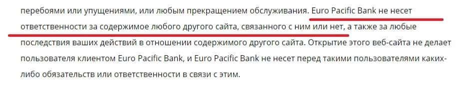 Согласно тому, что аферисты пишут в соглашении, компания Euro Pacific Bank не несет никакой ответственности за не полученную прибыль клиентом, а так же за возможные убытки.