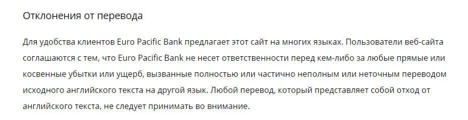 Аферисты Евро Пасифик Банк утверждают, что клиентское соглашение компании действительно лишь на английском языке, поскольку перевод может быть не верным.