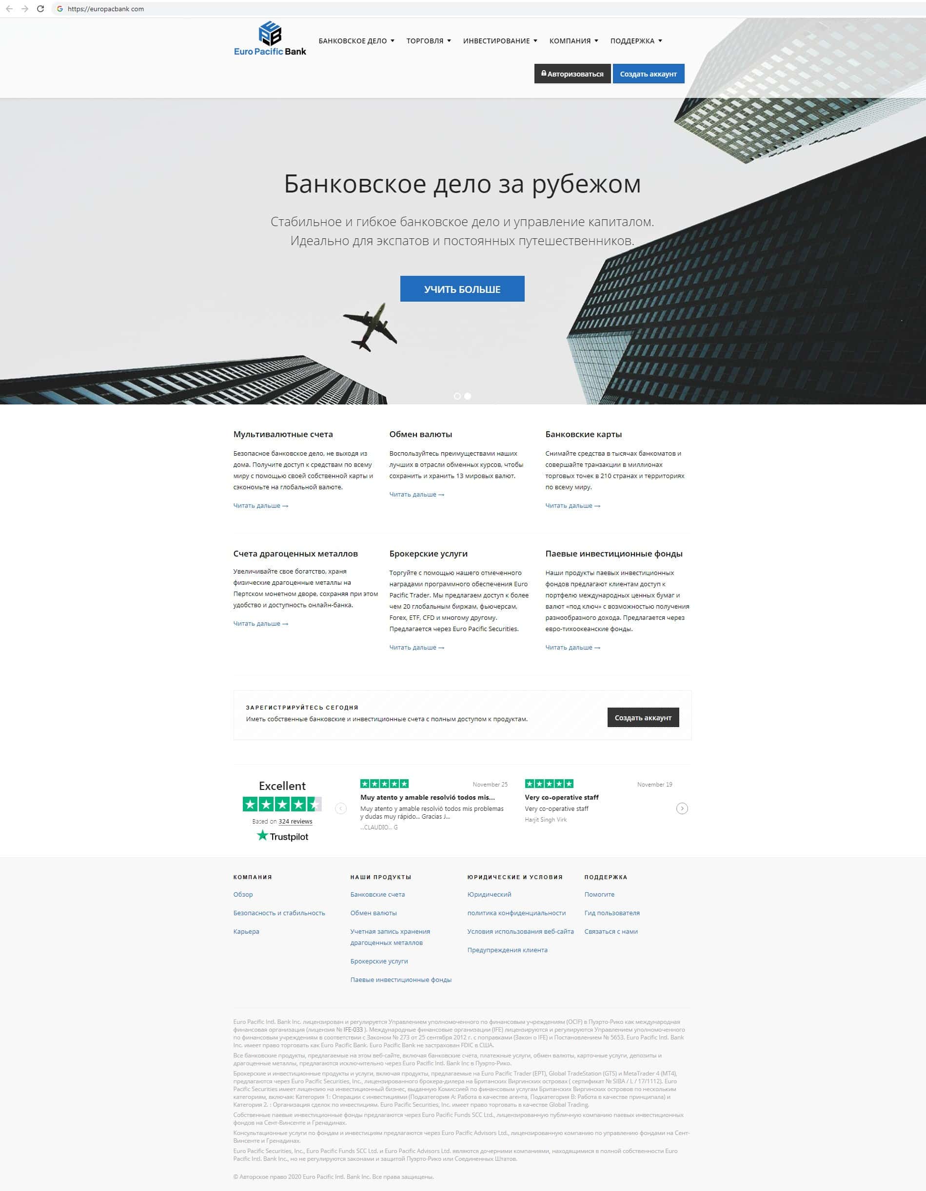 - Обзор главной страницы мошеннической организации Euro Pacific Bank