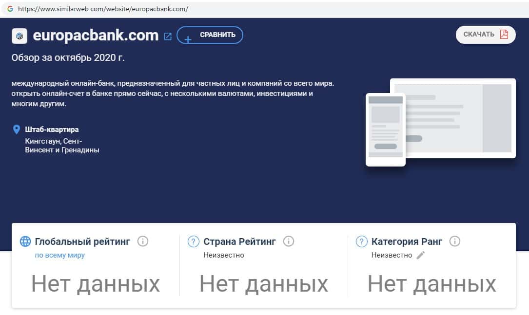 При проверке источников бренда по странам конторы Евро Пасифик Банк на сайте similarweb com, информация отсутствует, что является признаком фейкового лохотрона.