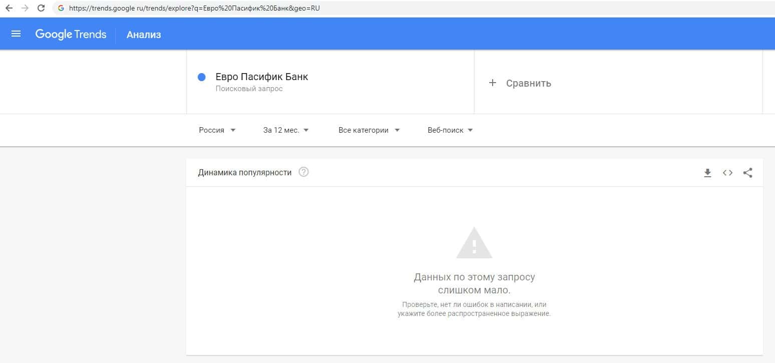По количеству брендовых запросов названия компании на русском языке "Евро Пасифик Банк" на Трендс Гугл Ру нет никакой информации.