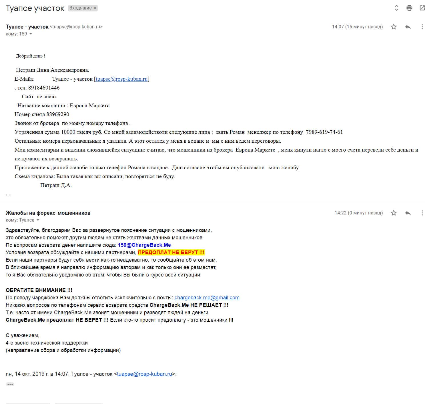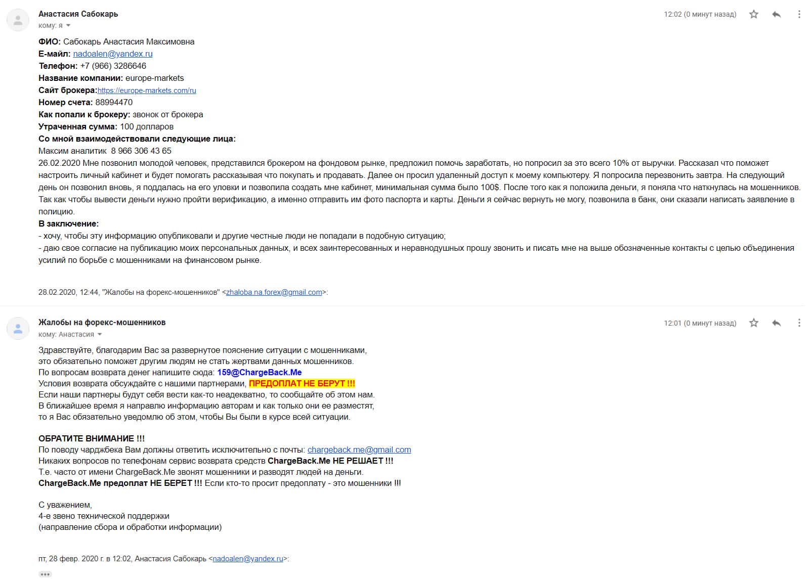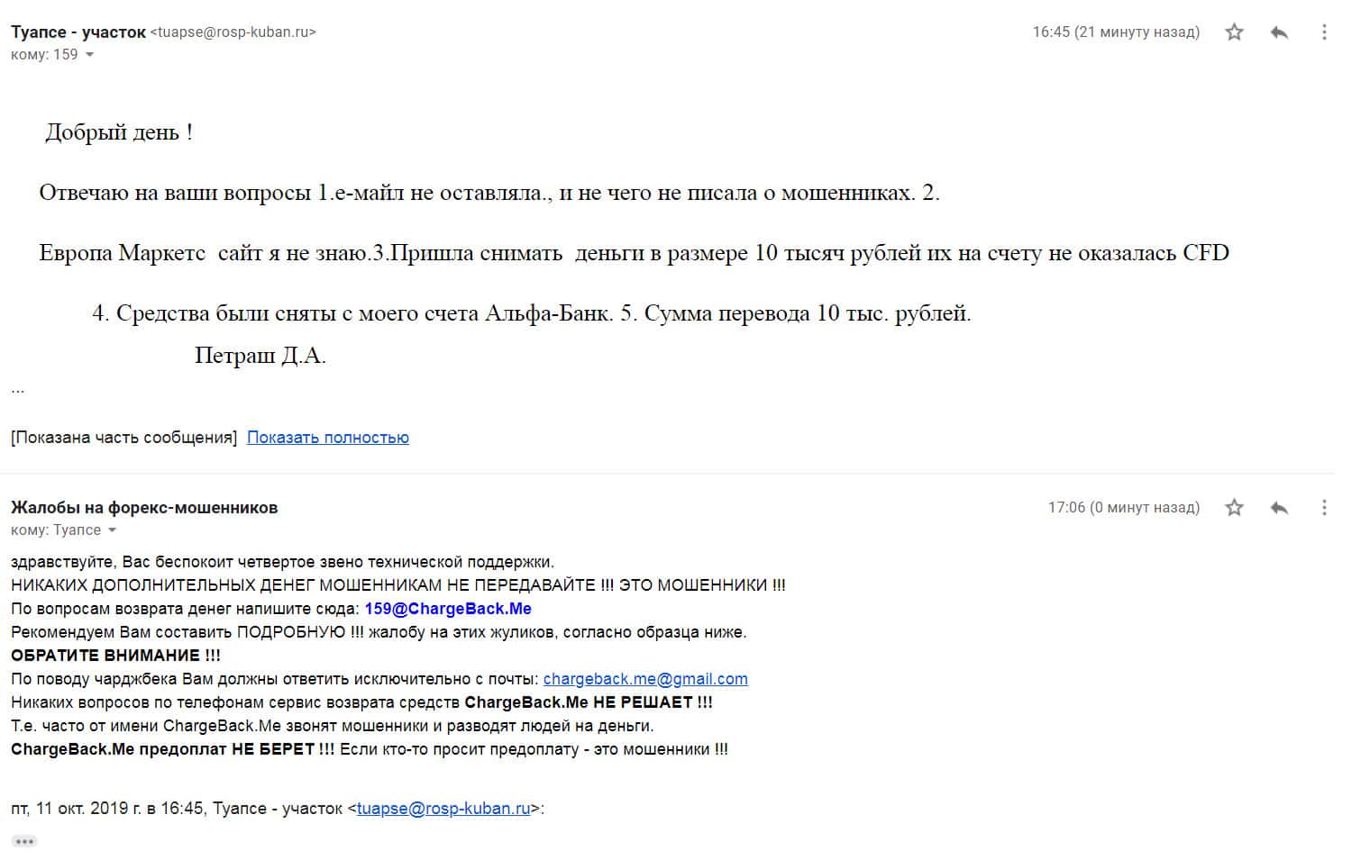 Детальная жалоба на Европа Маркетс - клиент потерял 10 000 рублей