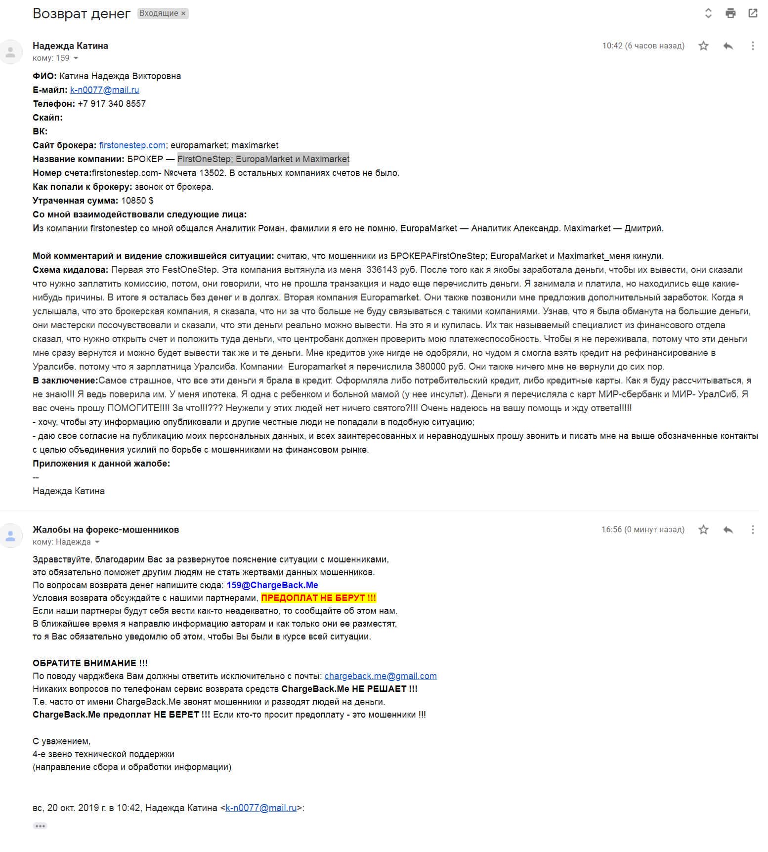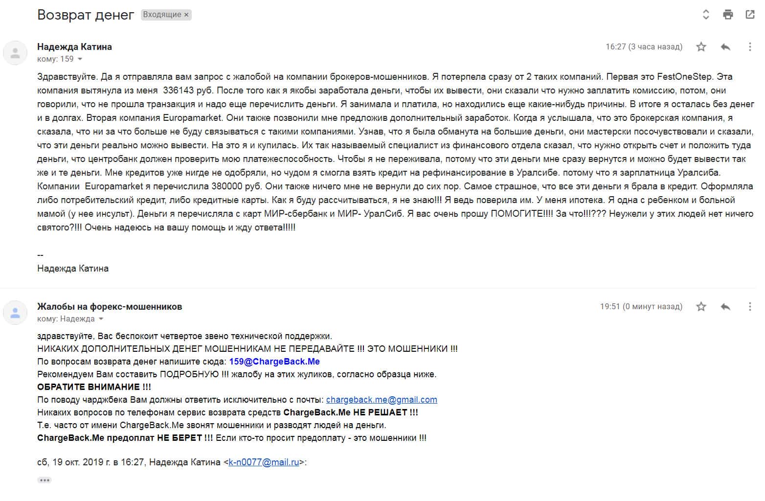 С этой жертвой аферисты EuropeMarkets обошлись очень жестко. Поскольку данная контора - лишь часть пирамиды, засевшей в сети, когда их подельнички из шараги FestOneStep обули женщину на 300 с лишним штук, они предложили ей якобы помочь вернуть эти деньги. В итоге у клиентки увели почти 700 000 рублей.