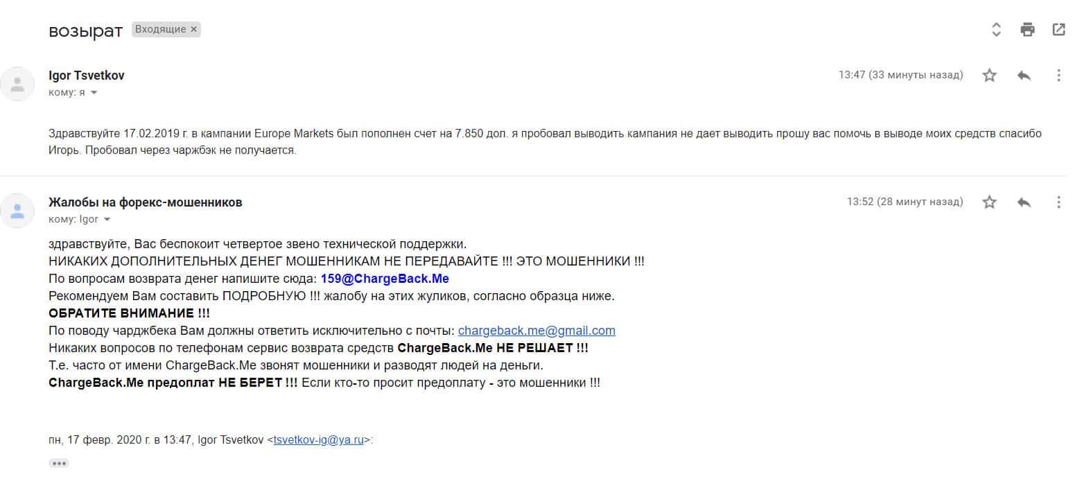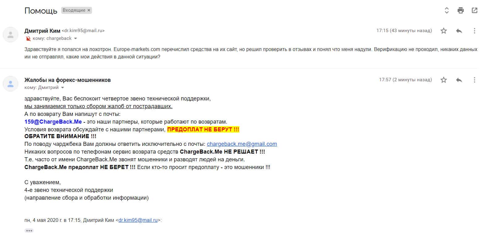 В том случае если аферист - Европа Маркетс ограбил Вас, или Вас данные жулики пытались кинуть, то тогда просим сообщить свой электронный адрес в форме связи далее, и тогда мы с Вами установим контакт.