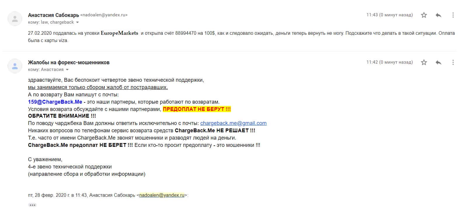 Далее представлена еще одна жалоба на скам-организацию EuropeMarkets. Девушка утверждает, что ей написали аферисты на почту, с предложением заработать довольно неплохие деньги. Клиентка согласилась, не подозревая, что её хотят обмануть. И всё дошло до того, что у пострадавшей украли приблизительно 6000 долларов, а шулеры вымогают еще.