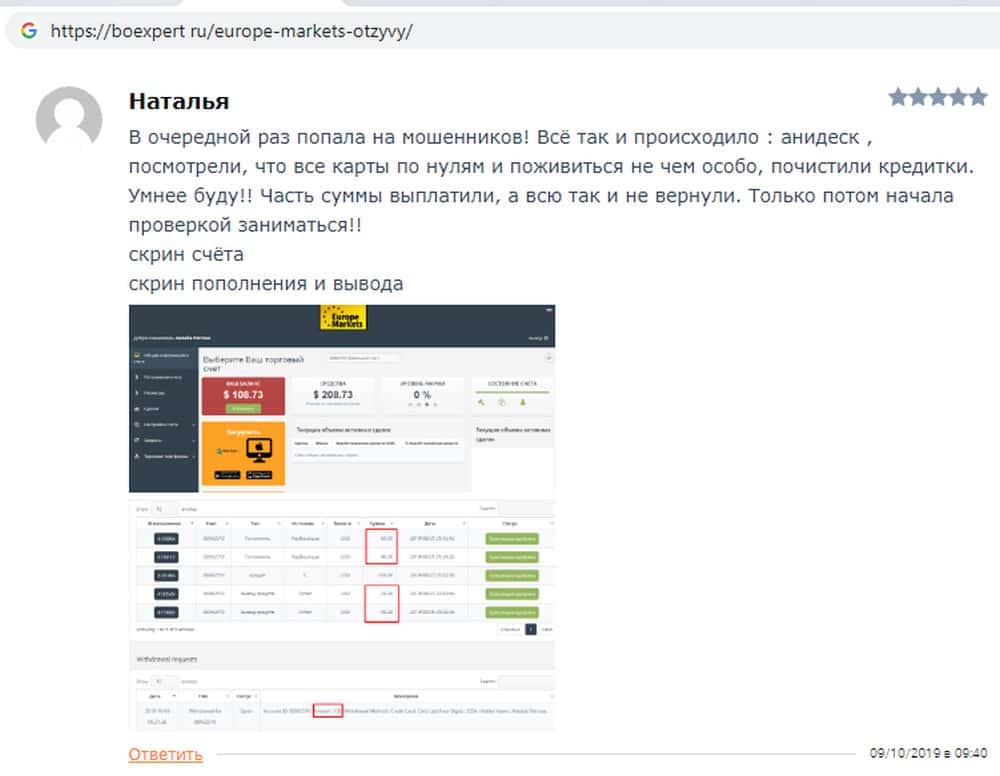 Внешне сотрудничество с EuropeMarkets выглядит красиво и правдоподобно. Жулики заключают с клиентом сделки, повышая его прибыль. После этого деньги с клиентского счета улетают, а аккаунт обнуляется. Связаться с конторой становится невозможным. Всё это доказывает расследование очередных экспертов.