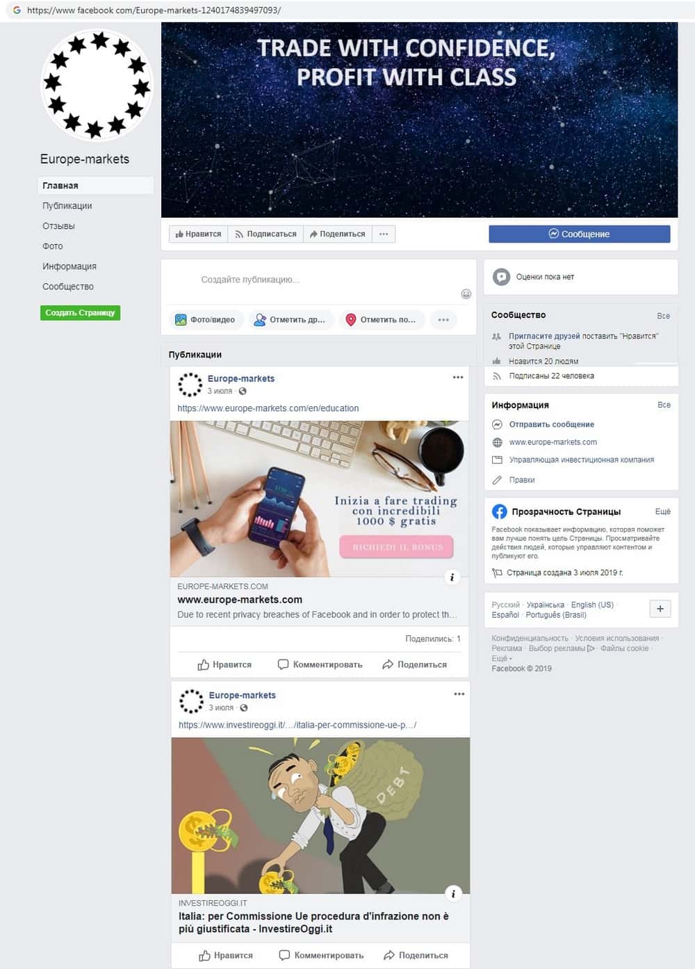 Для привлечения большего числа олухов Европа Маркетс разместили страницу в популярной социальной сети Facebook. Аккаунт мошенников выглядит вполне посредственно: все их 5 публикаций сделаны 3 июля этого года. Очевидно, это не мешает им заманивать и дурить сотни людей.