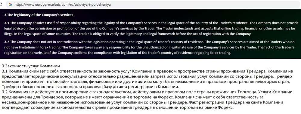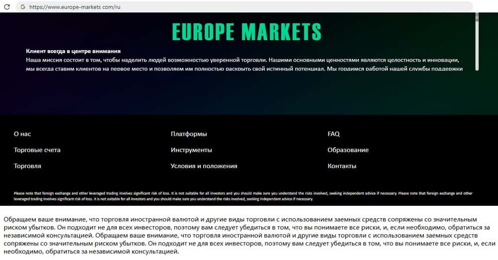 Внимательный трейдер увидит внизу сайта EuropeMarkets дисклеймер. Умники снимают с себя всякую ответственность, а при попытке гостя вывести деньги твари просто не отвечают. Самое главное, что никто из них никогда не ответит за содеянное.