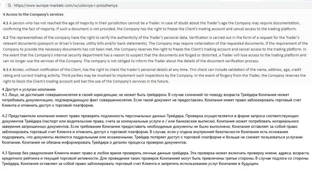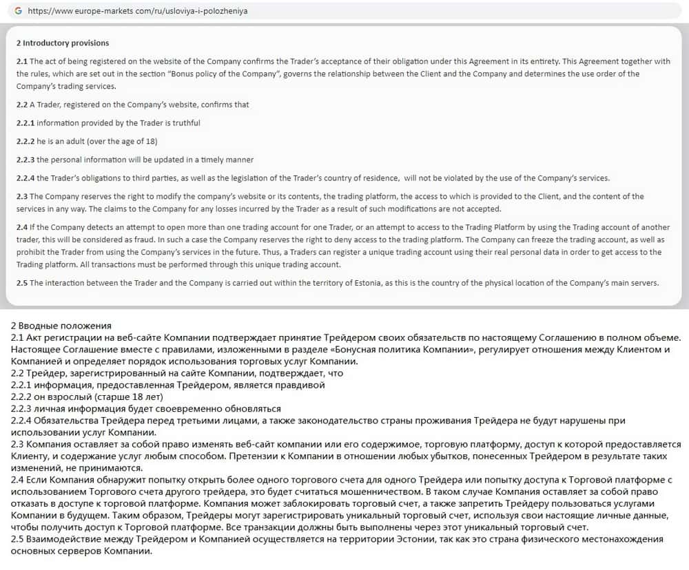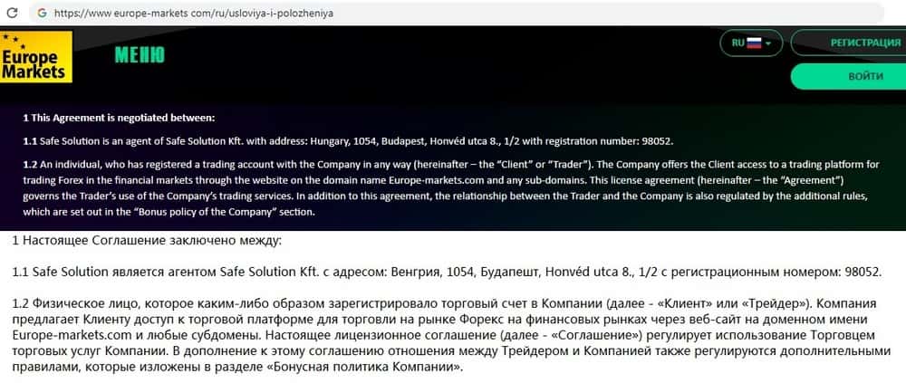 Первым делом стоит обратить внимание на то, что договор Европа Маркетс написан на английском, хотя весь остальной контент сайта - русскоязычный. Это подозрительно, но посмотрим далее. Вообще непонятно, откуда дебилы содрали это соглашение, там указана абсолютно другая компашка.
