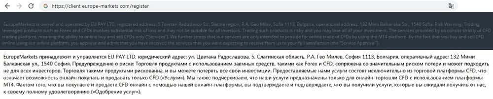 Контора EuropeMarkets, как и другие подобные шараги, не сообщает о себе правдивой информации. Но если поискать, то можно найти интересные данные. Например, управляет компанией Европа Маркетс некто EU Pay LTD. Находится шарага на этот раз в Болгарии. Явно, что везде на их сайте - ложь и развод.