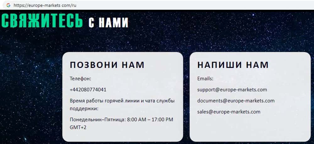 Судя по всему, любые предоставленные контактные данные конторы EuropeMarkets неправдивы и могут измениться в любое время. Обычно лохотронщики наяривают с одного и того же номера. Стоит запомнить его, чтобы не попасться к ним на удочку. Найденные контакты: