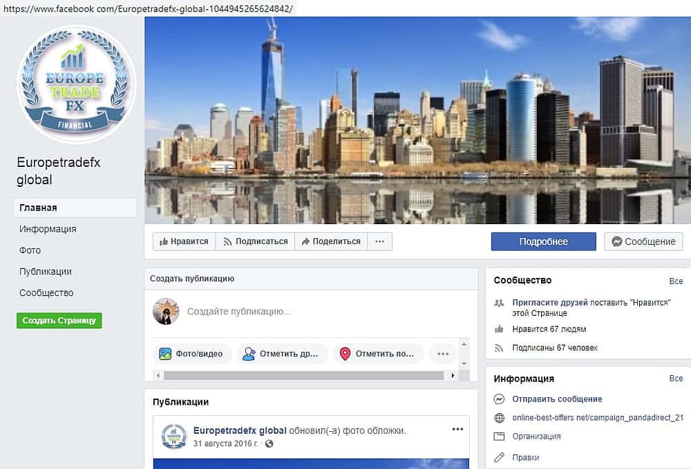 Имели они и страничку в соцсети facebook com для поиска потенциальных жертв, которая имеет последнюю запись датированную годом создания аферы Европа Трейд ФХ. На ней присутствует ссылка, которая ведет на некий сайт-одностраничник о торговле нефтью. Имеет логотип махинаторов Европа Трейд ФХ. Вероятно неудавшаяся очередная афера.