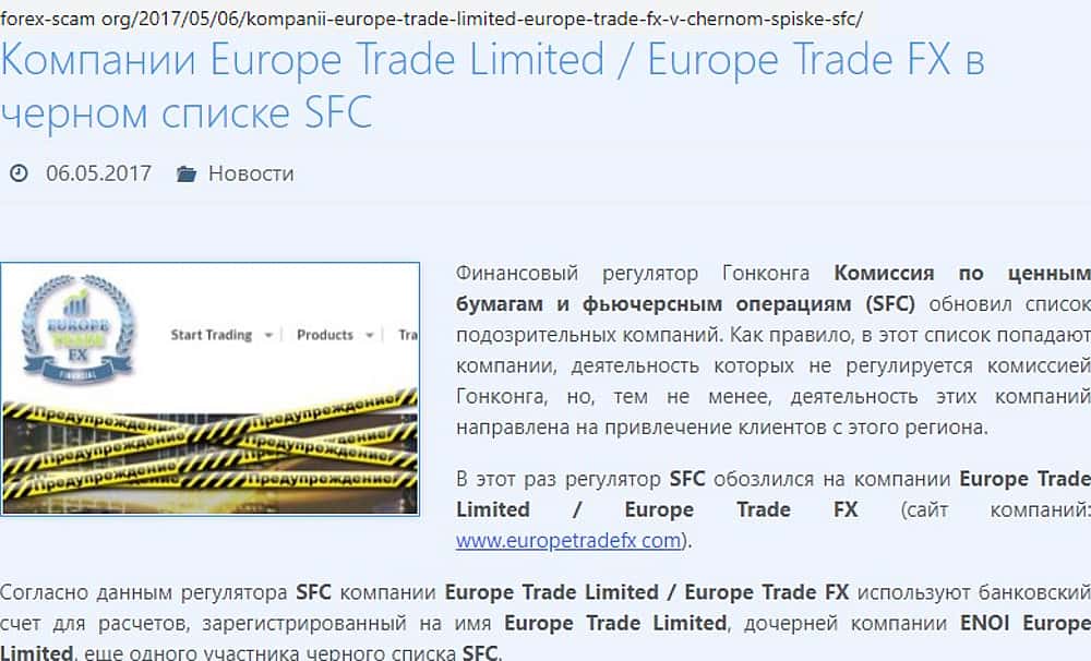 Независимый источник forex-scam org поведал, что мошенническая организация Европа Трейд ФХ попала в черный список регулятора Гонконга SFC. Аферюги Европа Трейд ФХ оказались дочерней компанией другой проштрафившейся мошеннической конторы ENOI Europe Limited. Ворованные средства попадали на общий счет.