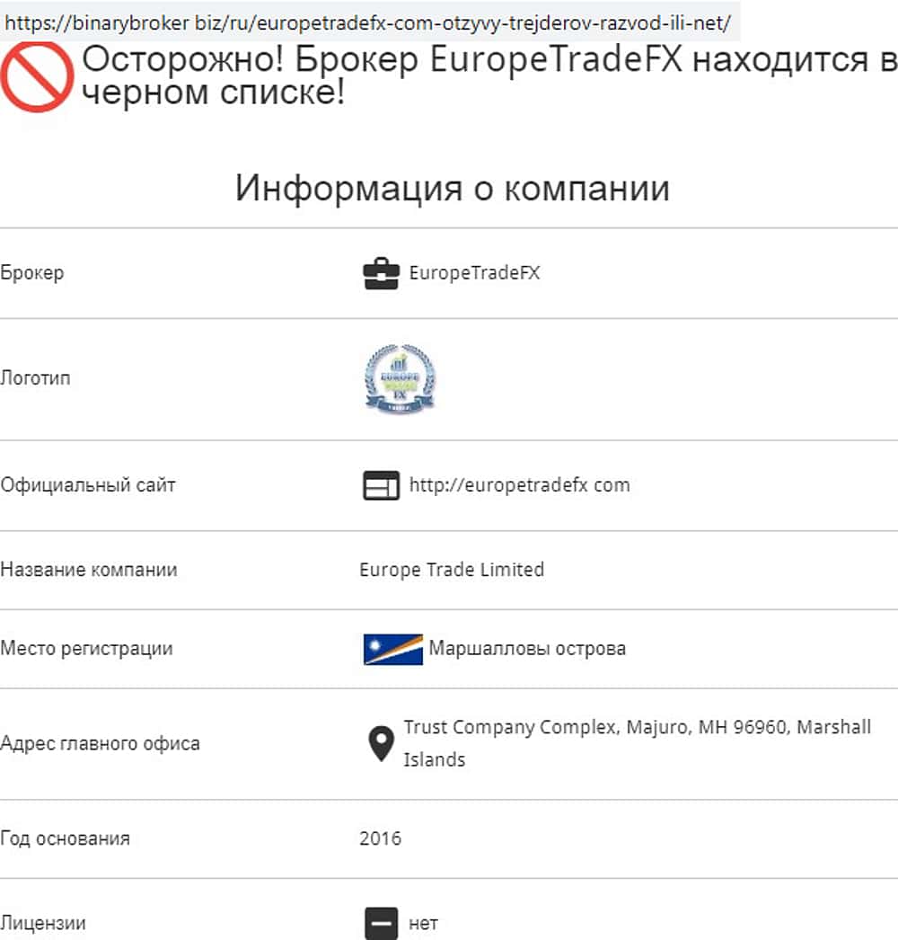 Псевдоброкерская контора Европа Трейд ФХ все же оставила свои следы на просторах интернета. По данным предоставленным независимым сервисом оценки благонадежности форекс-дилеров binarybroker biz, аферисты попали в черный список. Занимались своей незаконной деятельностью без лицензии с 2016 года в оффшорной зоне.