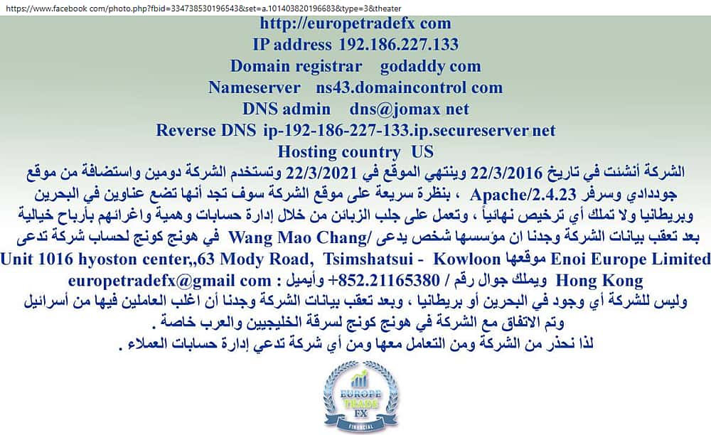 Кое-кто из пользователей социальной сети facebook com, успел сохранить информацию о сайте, когда он был во владении форекс-кухни Europe Trade FX. Здесь видно название компании, которая является материнской для лохотрона Europe Trade FX. Это одни и те же аферисты - ENOI Europe Limited!