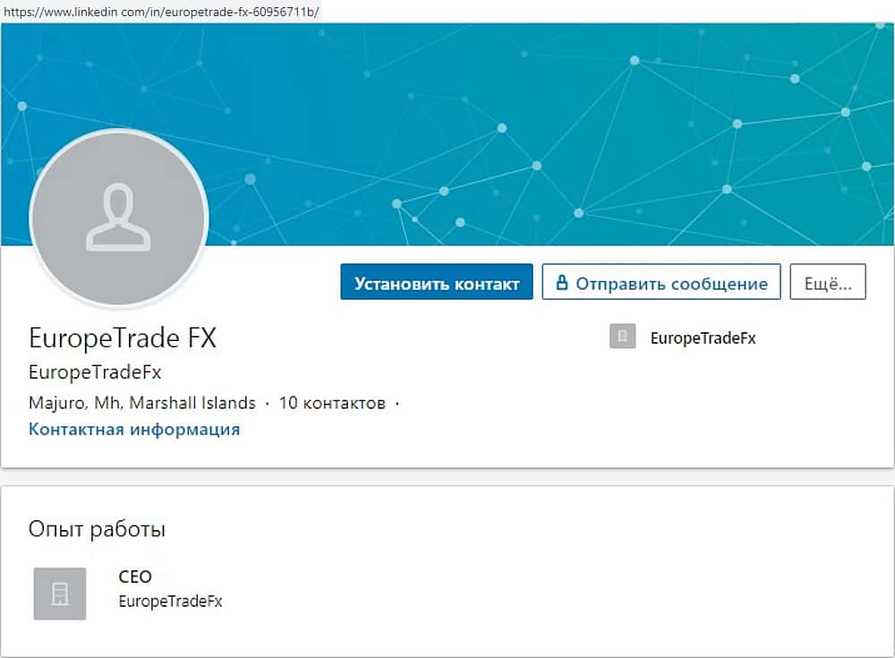 Нашелся также заброшенный аккаунт в социальной сети для поиска бизнес-контактов linkedin com. Видимо аккаунт создавался авантюристами Европа Трейд ФХ для придания своей шарашкиной конторе веса в глазах потенциальных клиентов. Страница абсолютно не информативна и служит для замыливания глаз.
