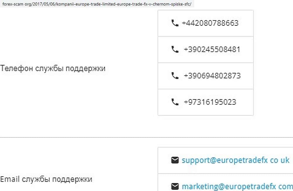 Пропавшие из вида на время жулики Европа Трейд ФХ связывались со своими жертвами посредством почты и телефона. Их удалось обнаружить на портале независимой оценки форекс-брокеров binarybroker biz. Теперь авантюристы Europe Trade FX вероятно уже используют иную связь, но их нужно знать. Контактные данные шулеров Europe Trade FX:
