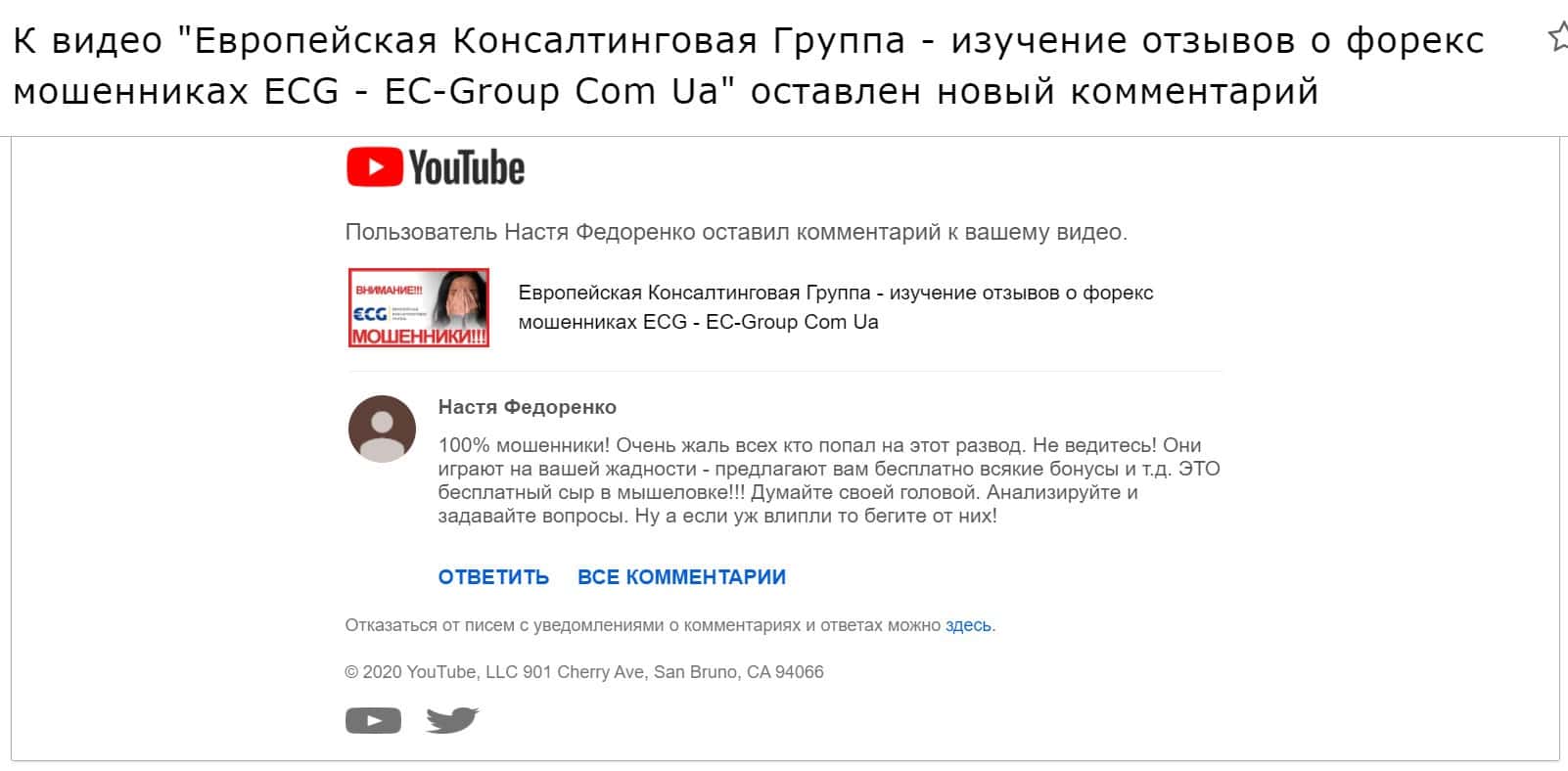 Далее на публикации представлен пост с информацией о мошеннической организации Европейская Консалтинговая Группа, комментарий был взят под видео о лохотроне EC-Group Com Ua.
