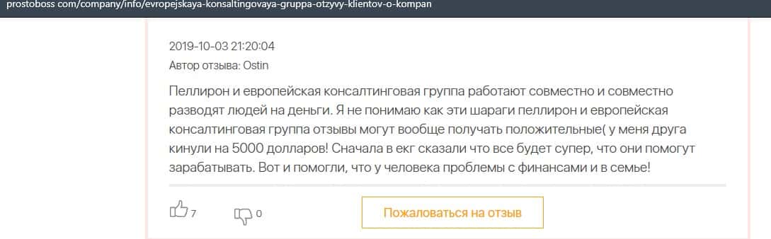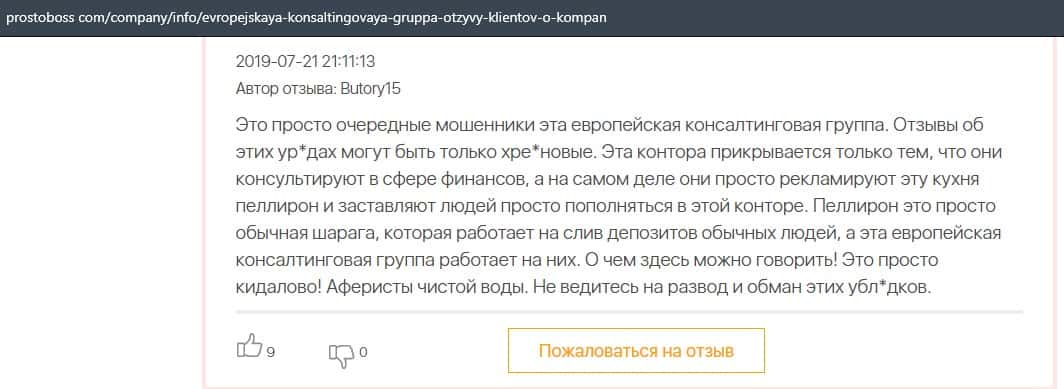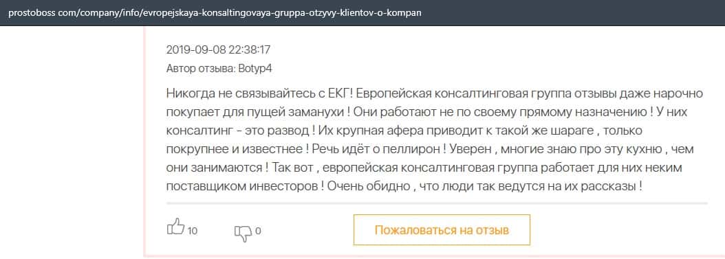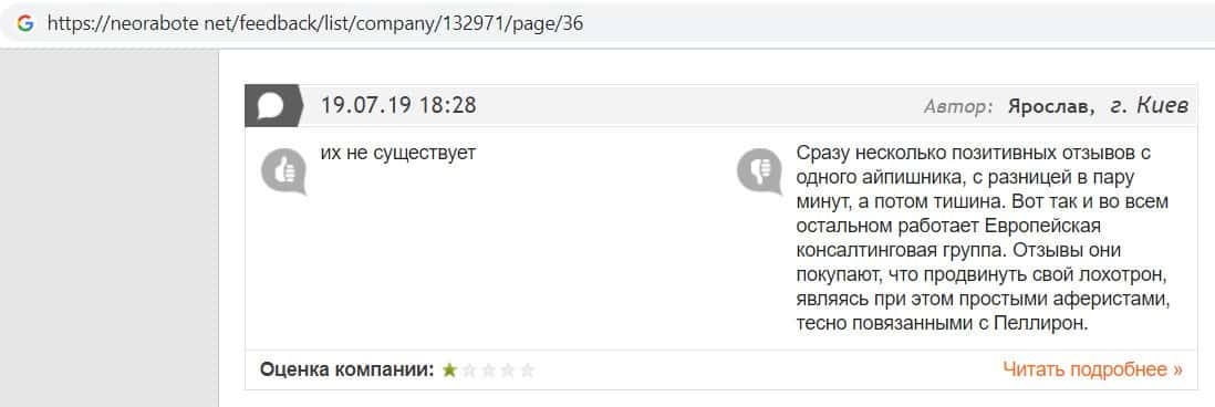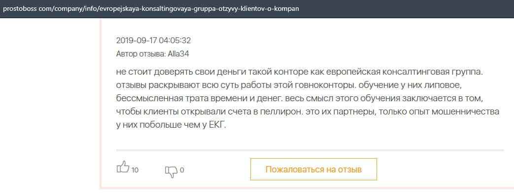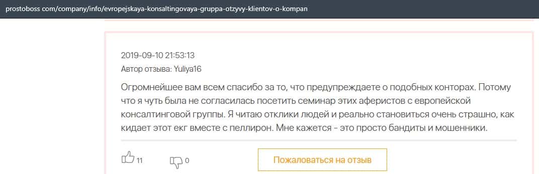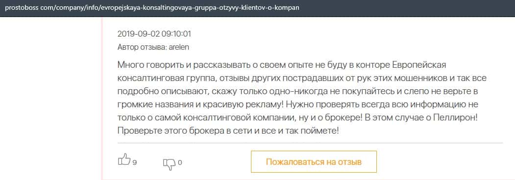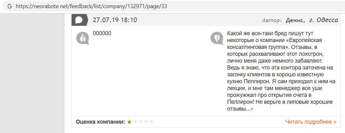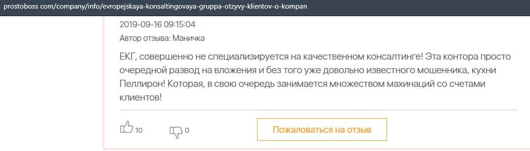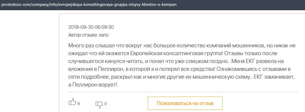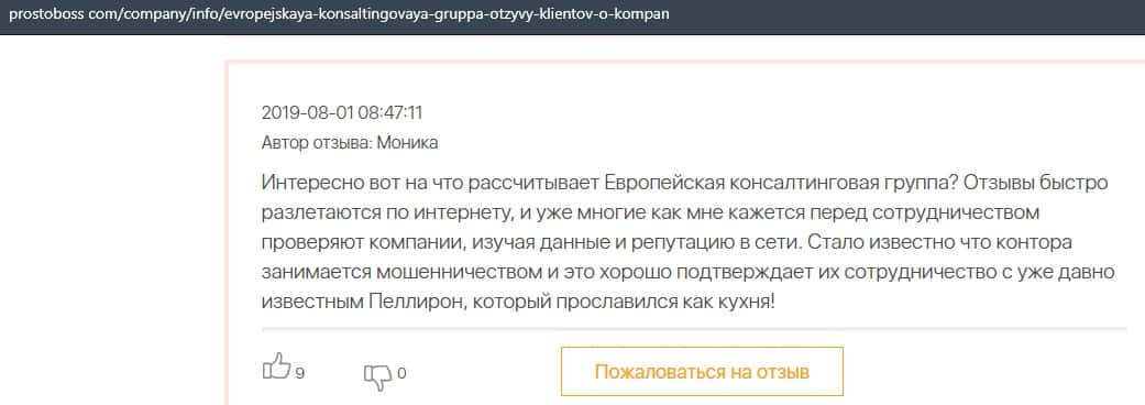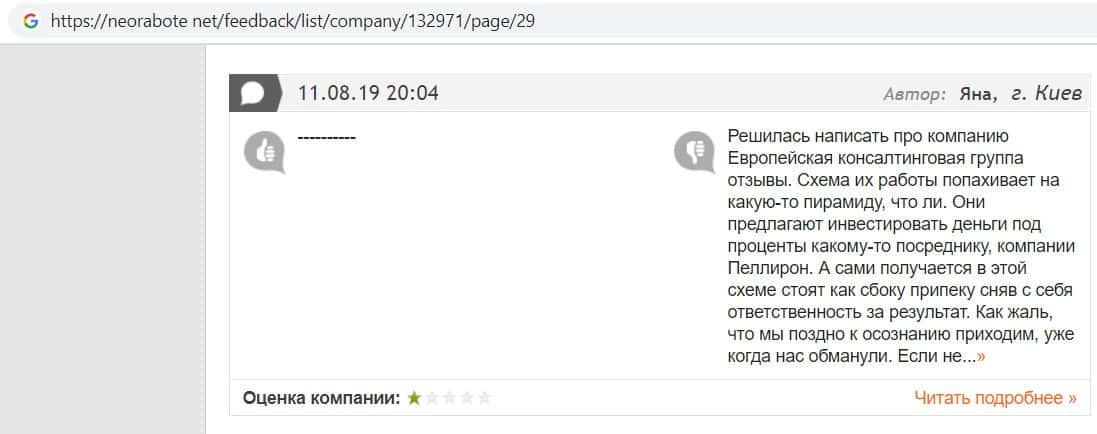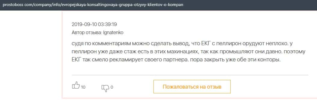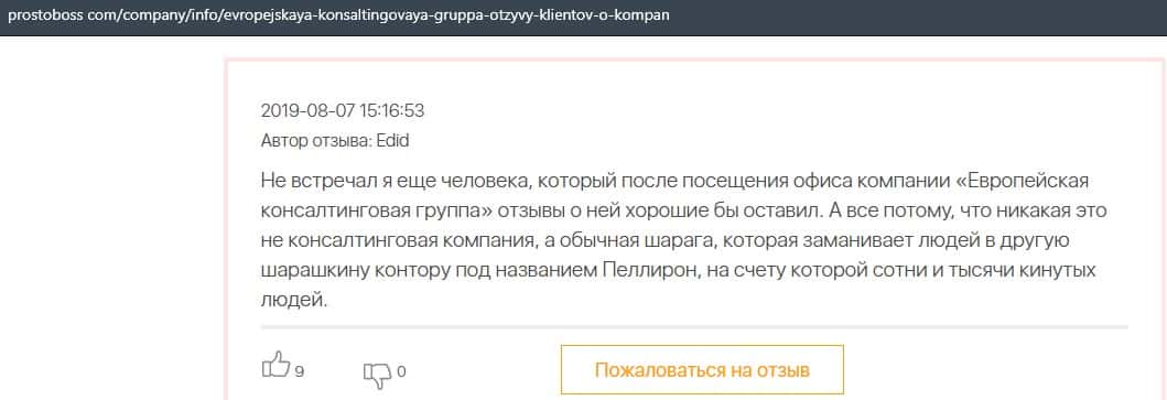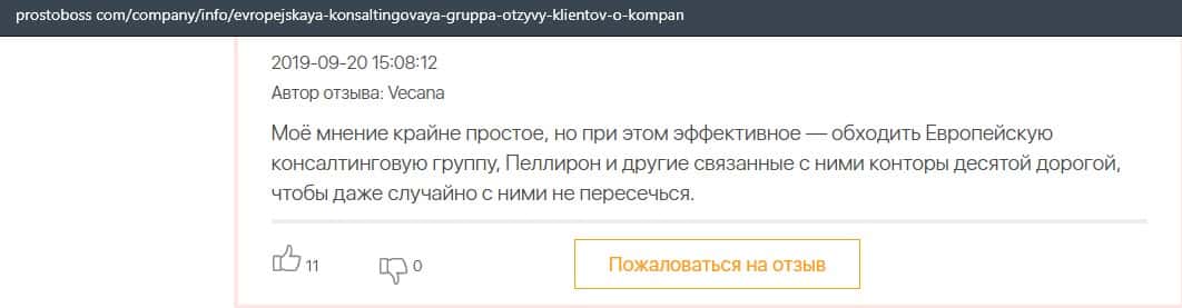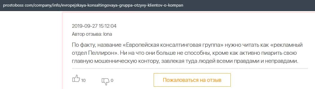 Далее представлен отзыв о лохотроне Европейская Консалтинговая Группа, где описываются моменты связи этой аферы с мошенниками Пеллирон.