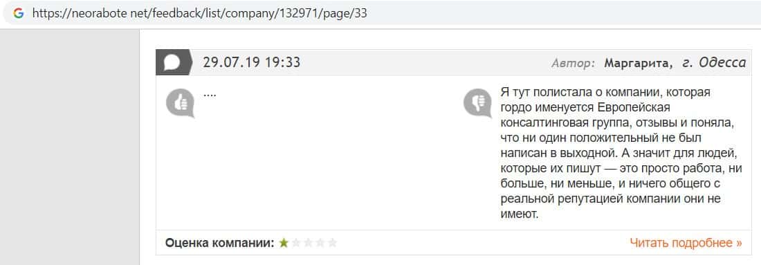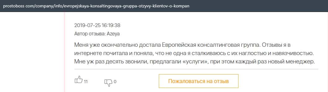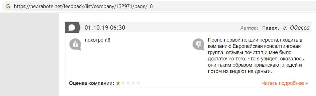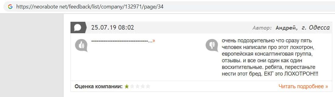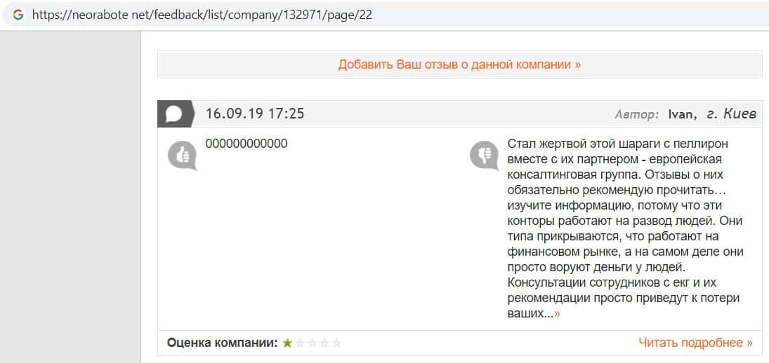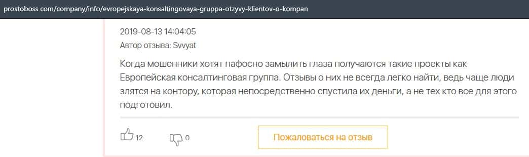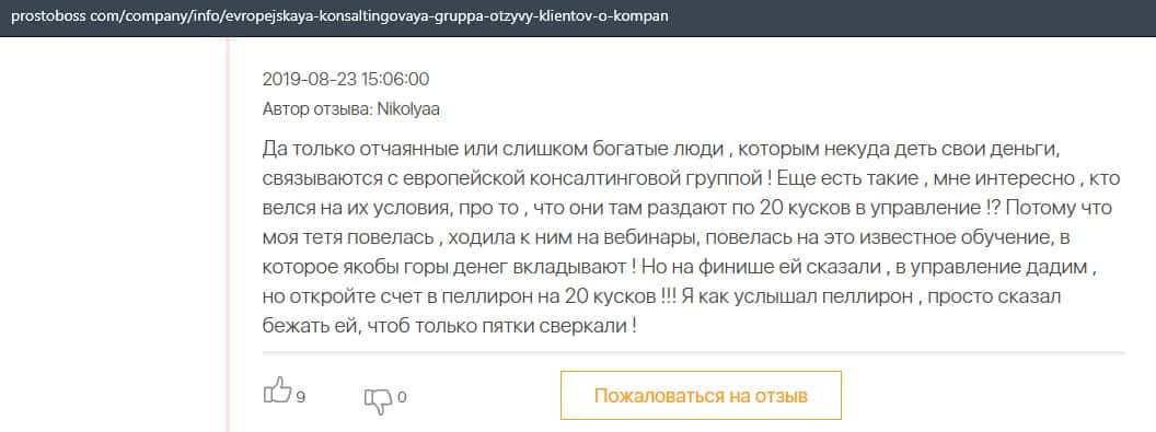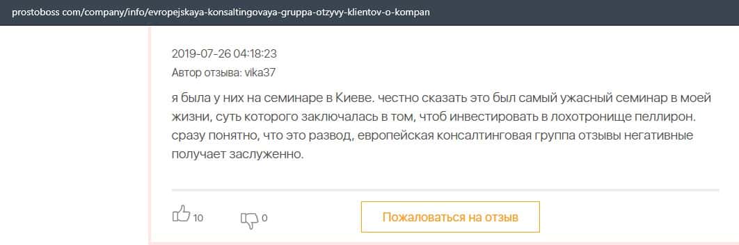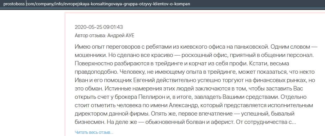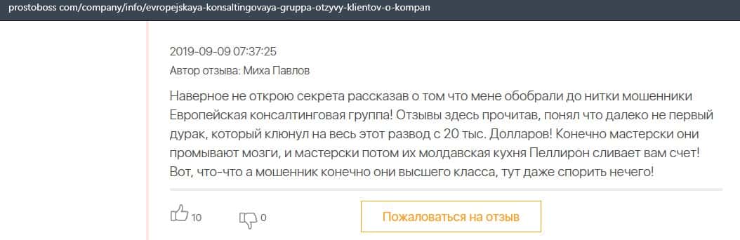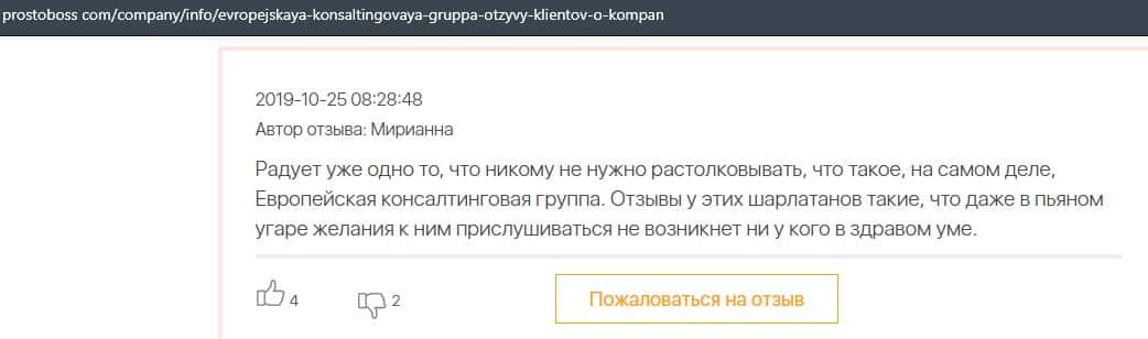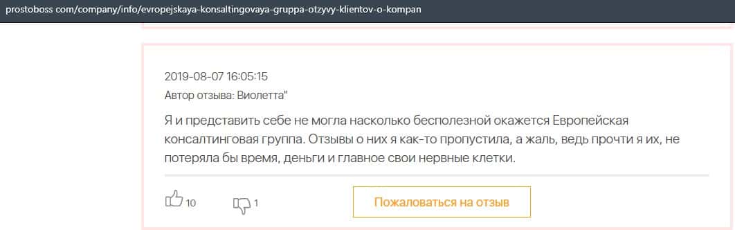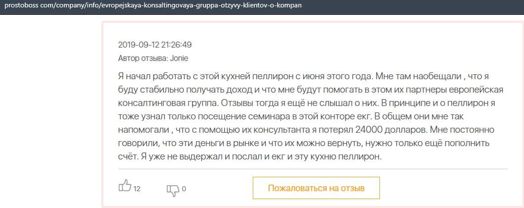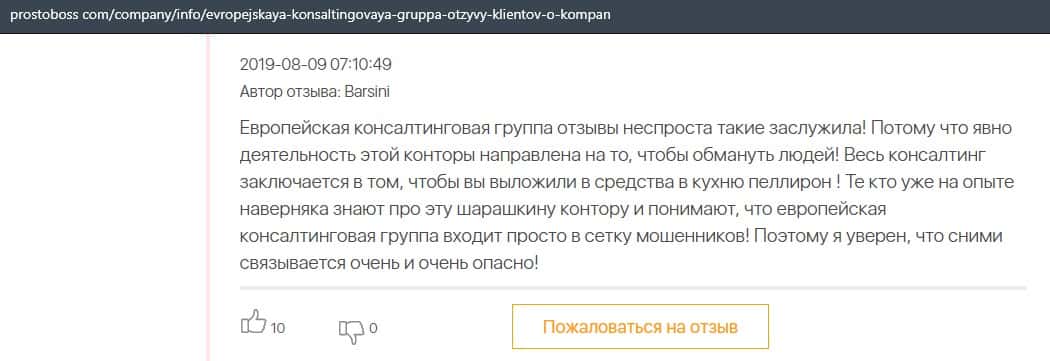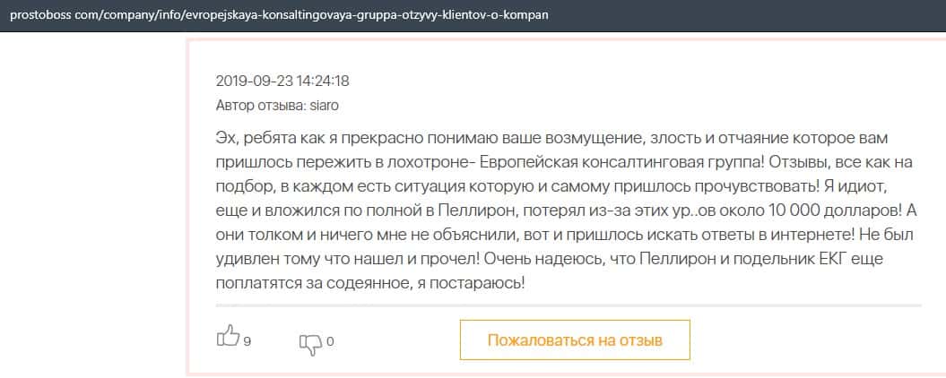 Далее представлен отзыв о лохотроне Европейская Консалтинговая Группа, где описываются моменты связи этой аферы с мошенниками Пеллирон.