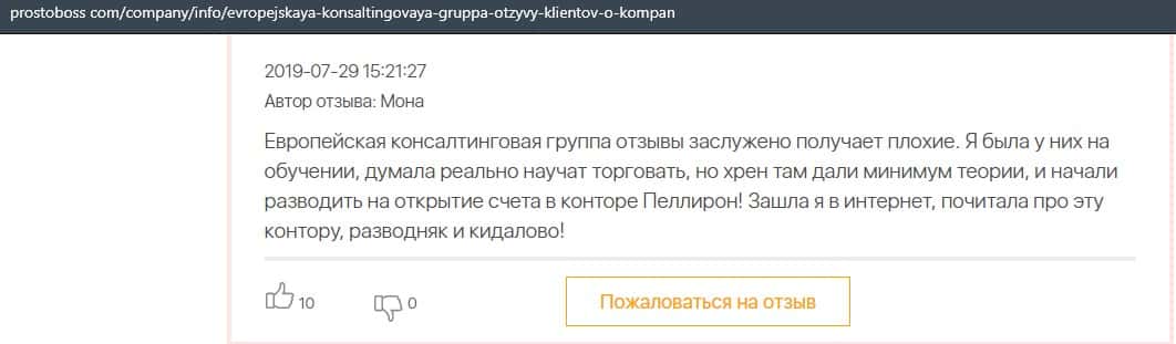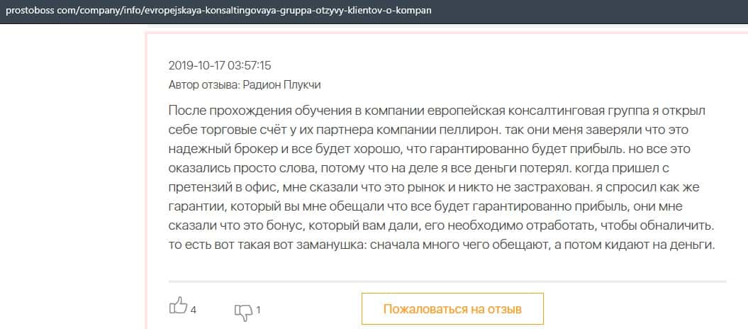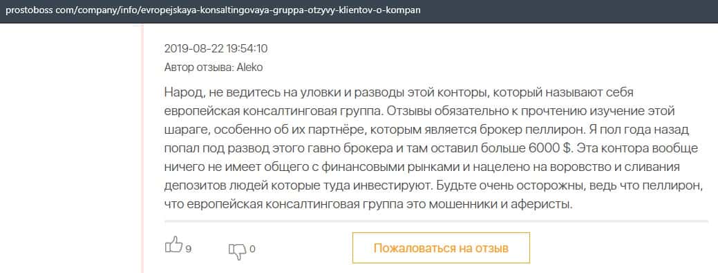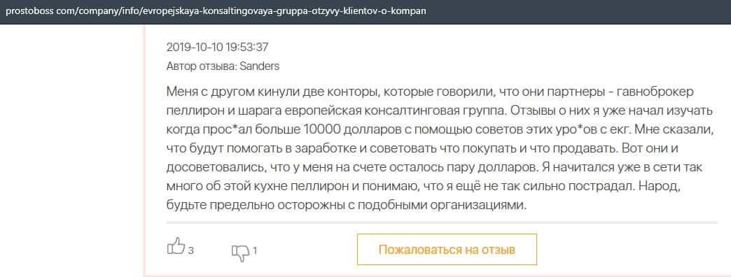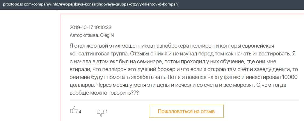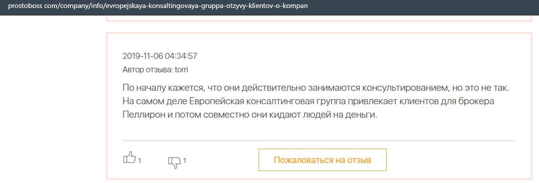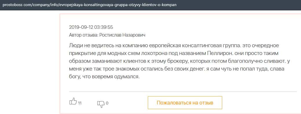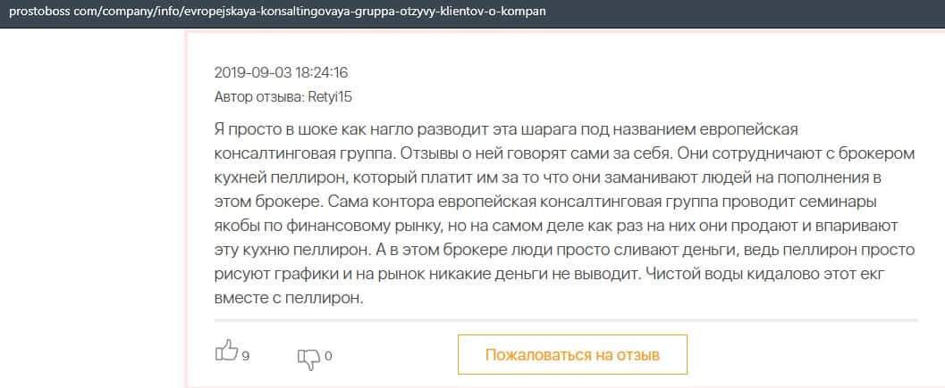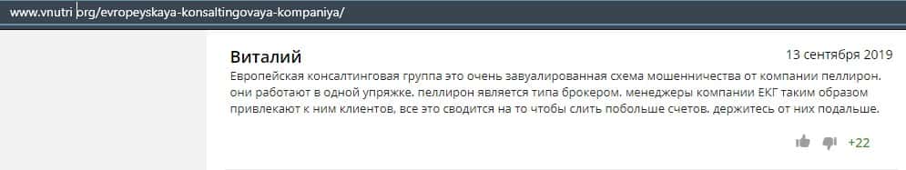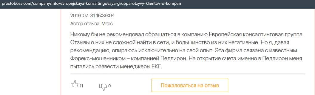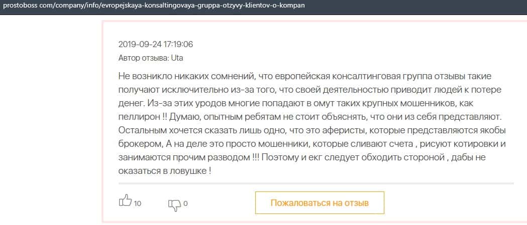 Негативные отзывы о конторе Европейская Консалтинговая Группа быстро разлетаются по интернету, но еще больше становится понятно, что они сотрудничают с брокером Пеллирон.