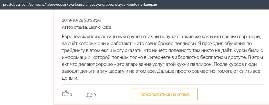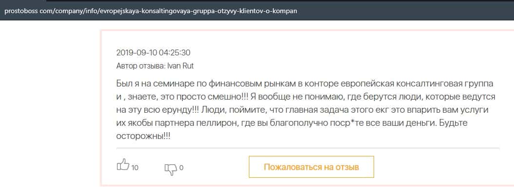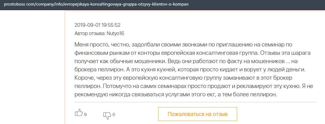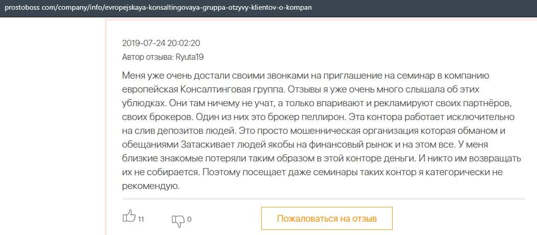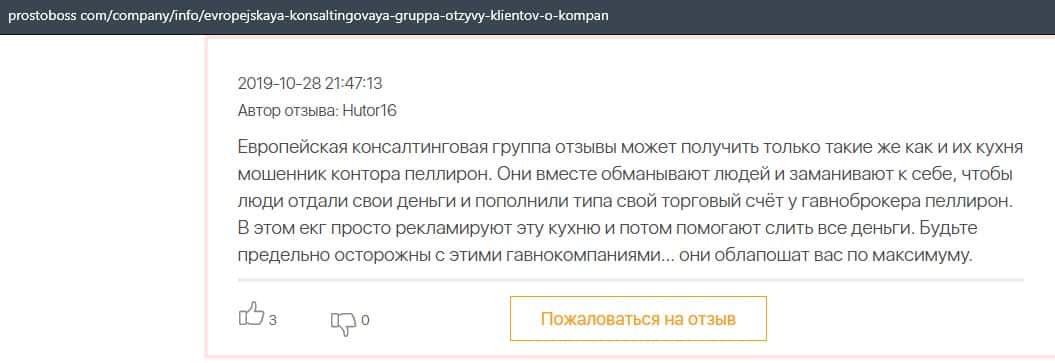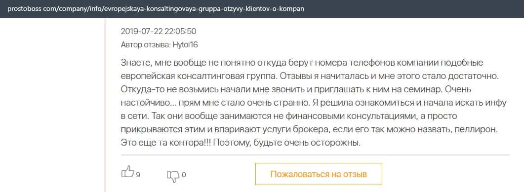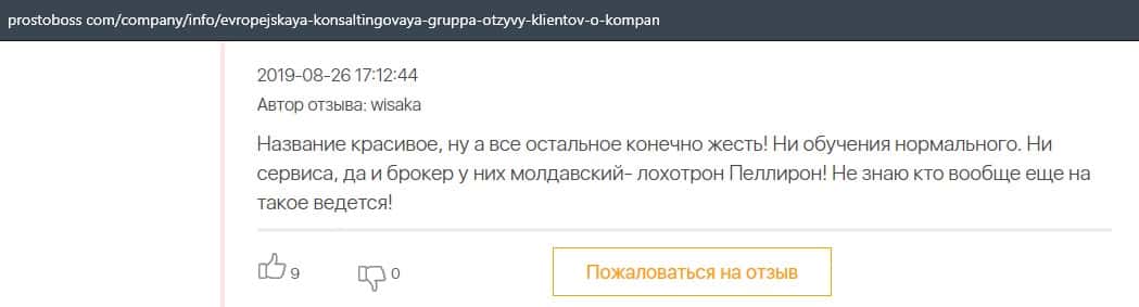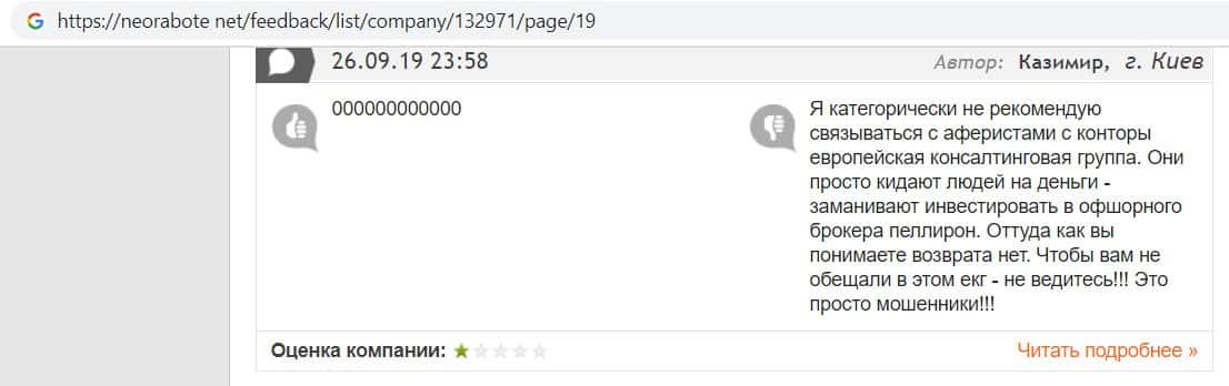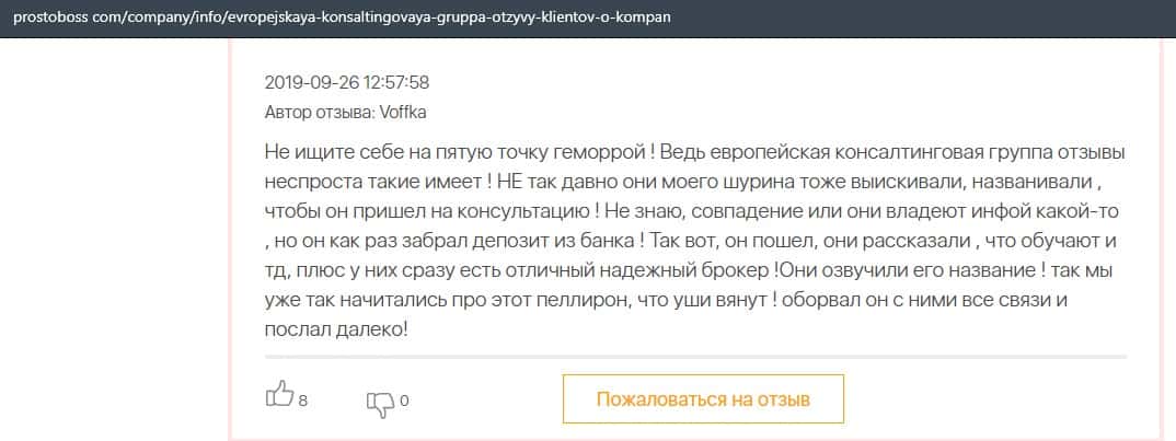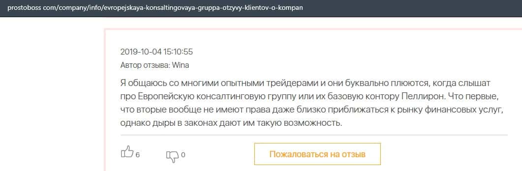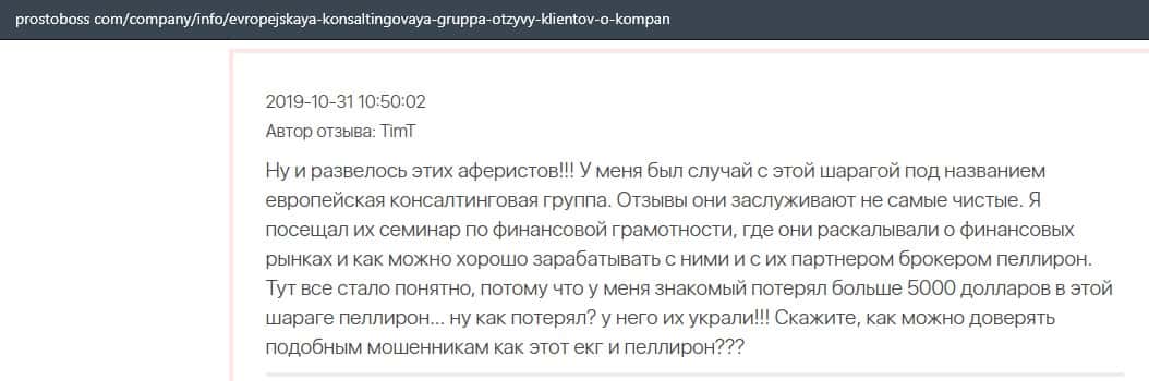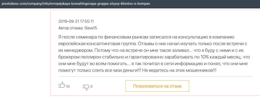 Негативные отзывы о конторе Европейская Консалтинговая Группа быстро разлетаются по интернету, но еще больше становится понятно, что они сотрудничают с брокером Пеллирон.