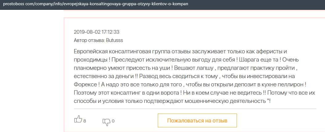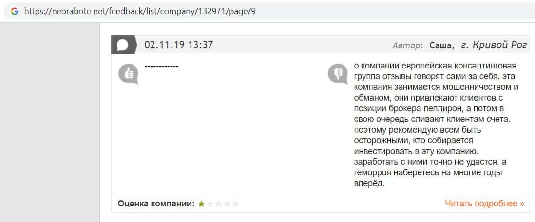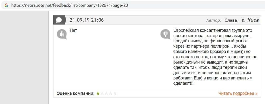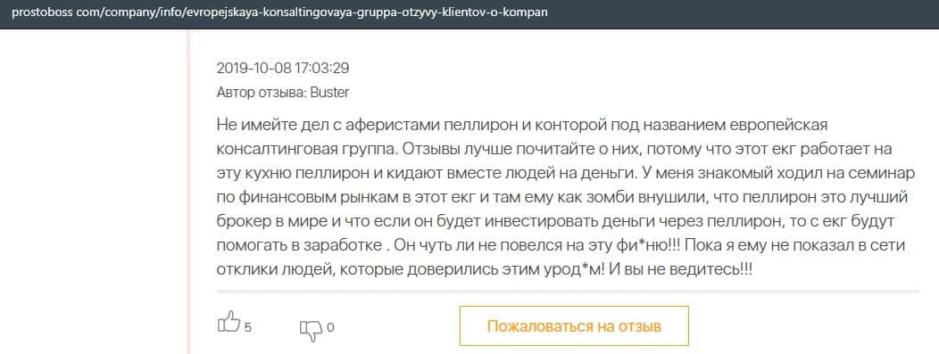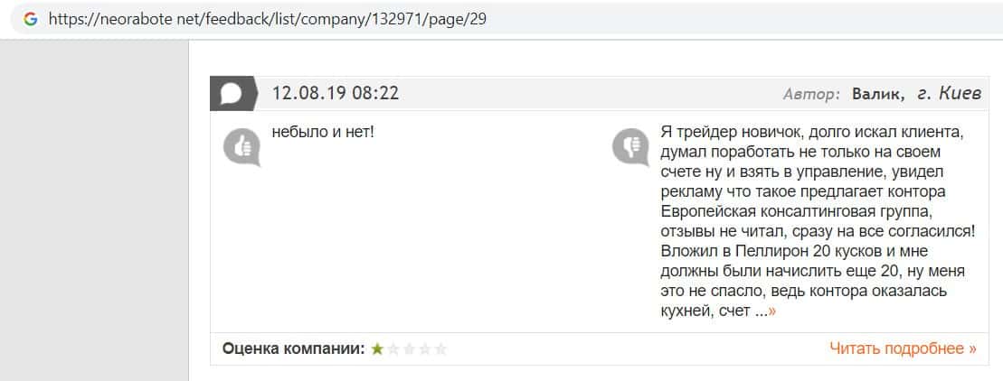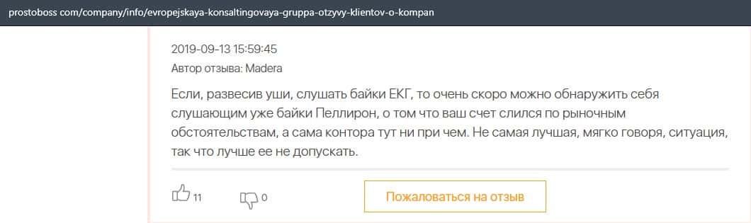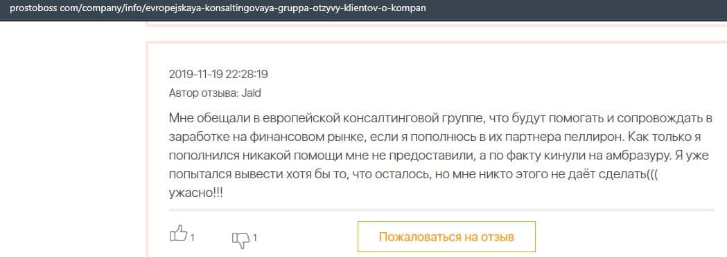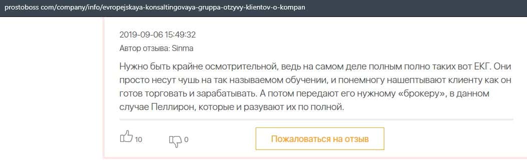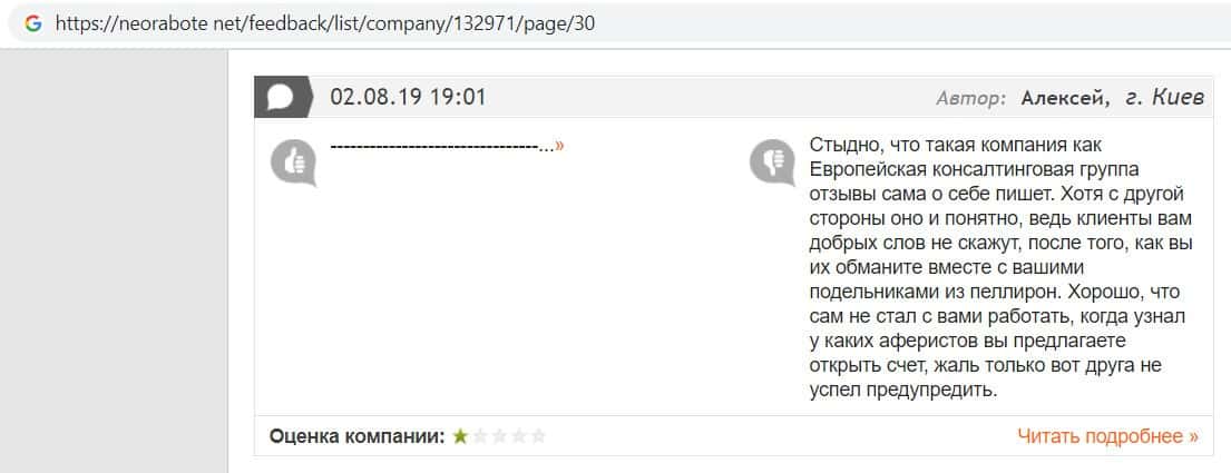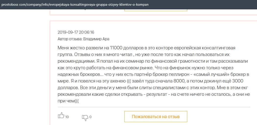 Негативные отзывы о конторе Европейская Консалтинговая Группа быстро разлетаются по интернету, но еще больше становится понятно, что они сотрудничают с брокером Пеллирон.