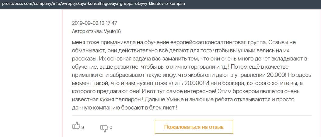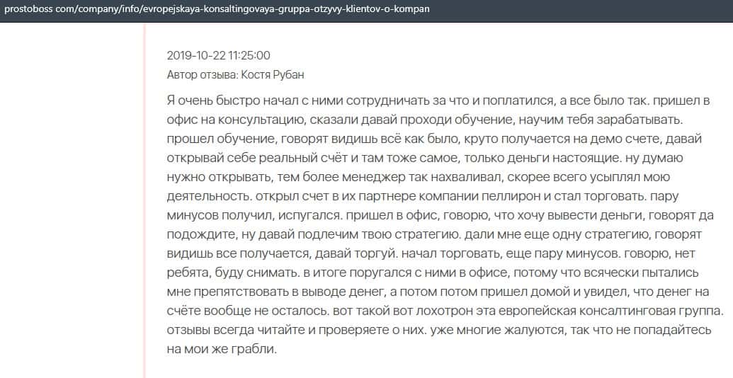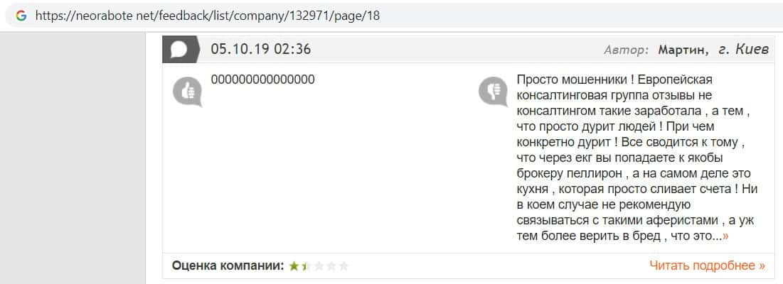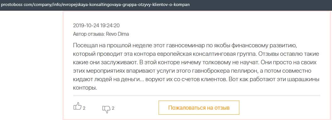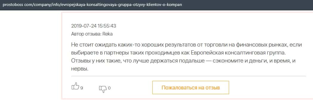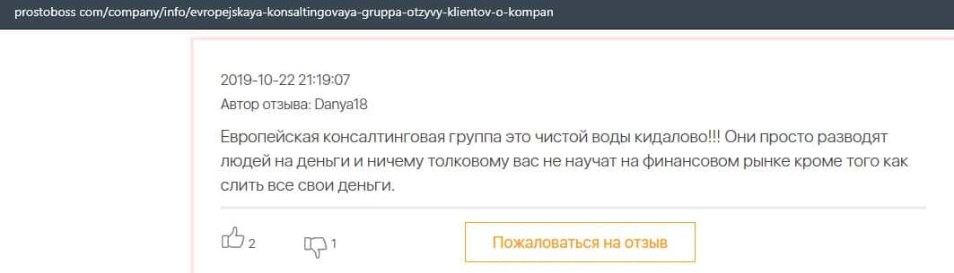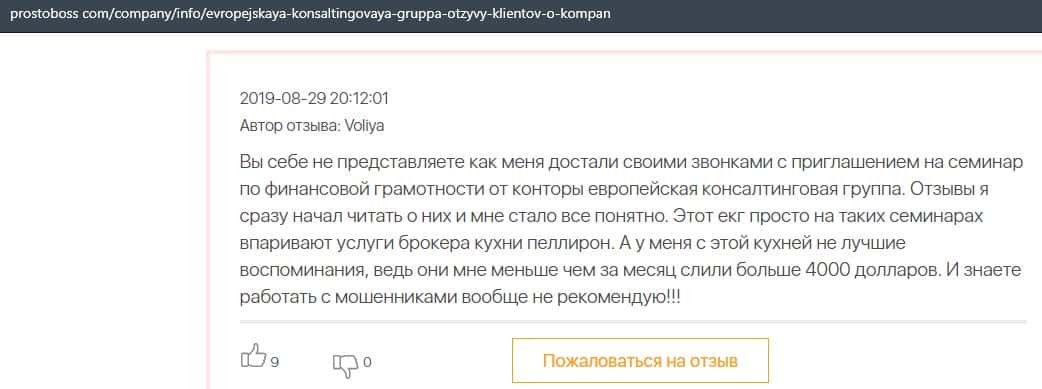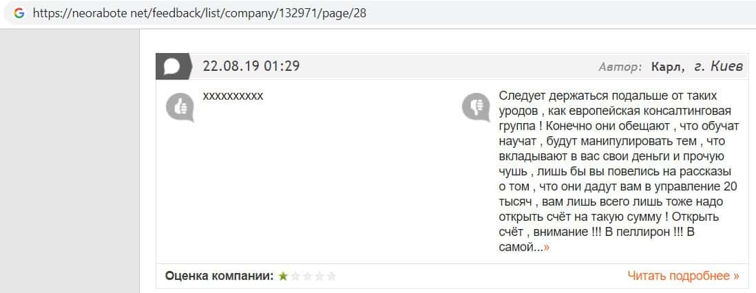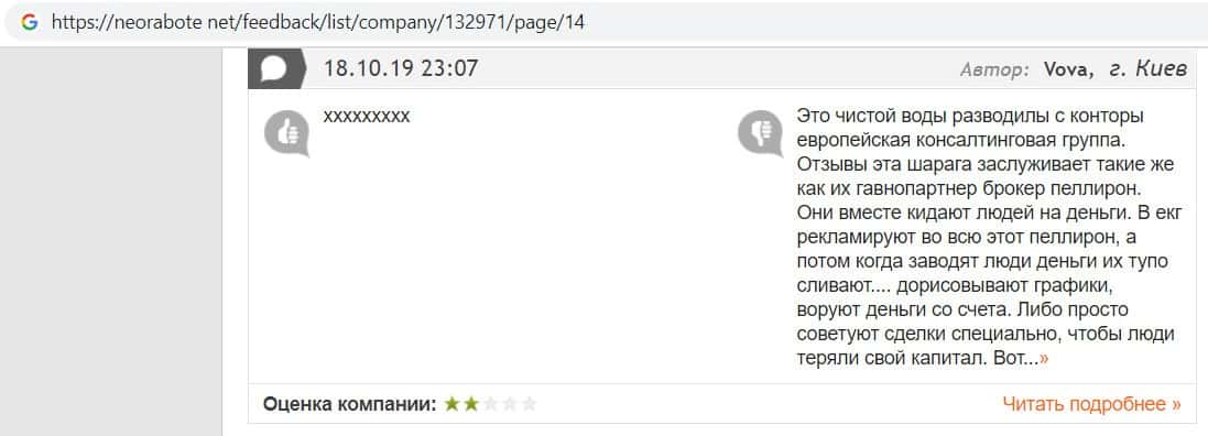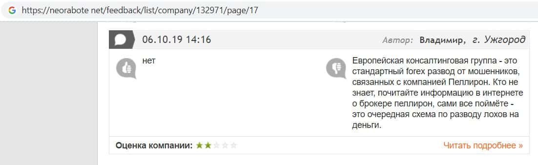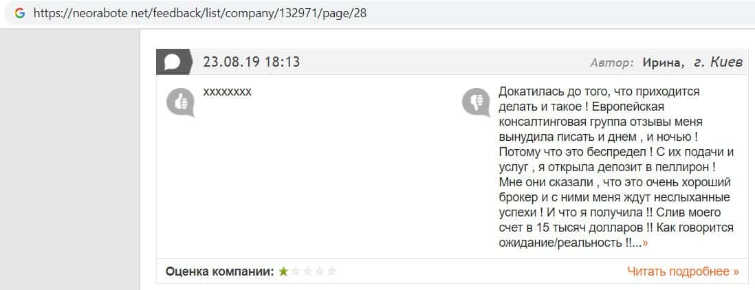 Негативные отзывы о конторе Европейская Консалтинговая Группа быстро разлетаются по интернету, но еще больше становится понятно, что они сотрудничают с брокером Пеллирон.