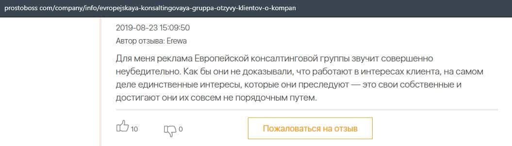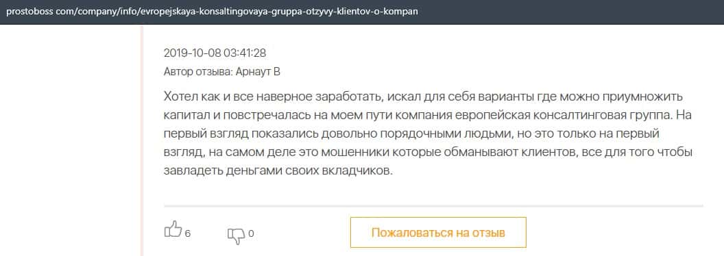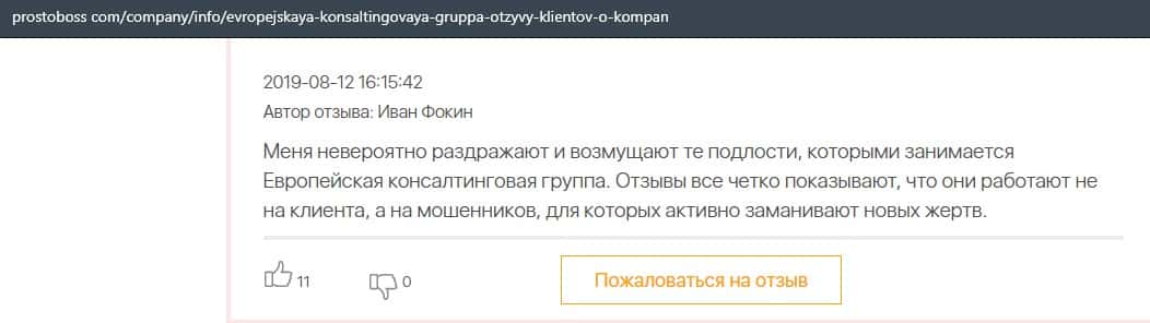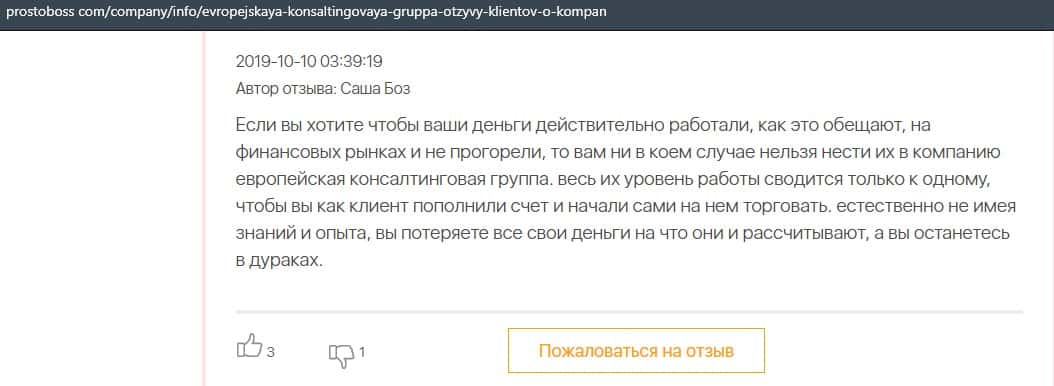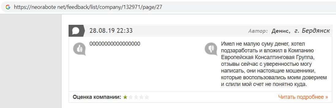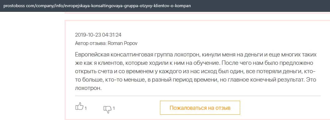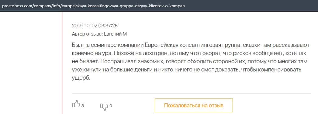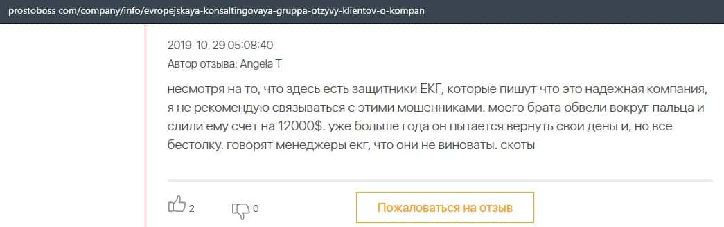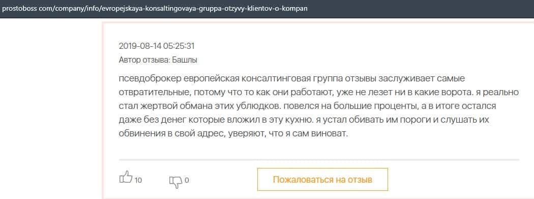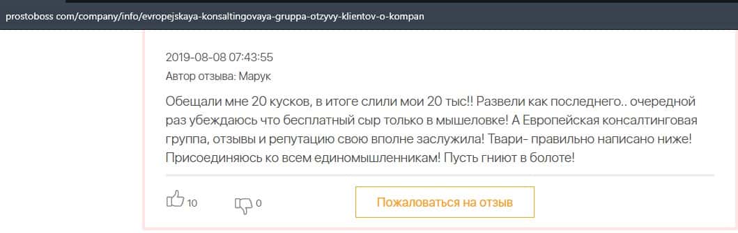 А в этом случае клиент конторы Европейская Консалтинговая Группа рассказал, что знакомый его потерял 5000 долларов, так как доверился уговорам разводил.