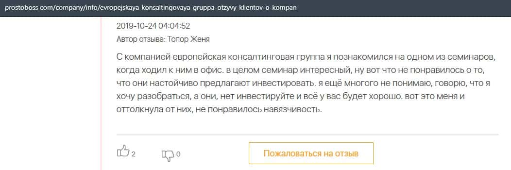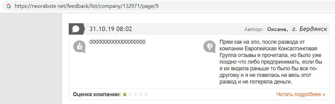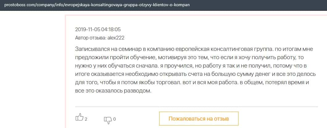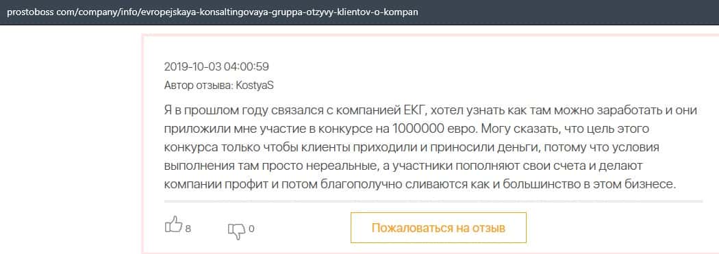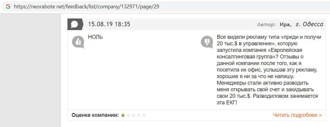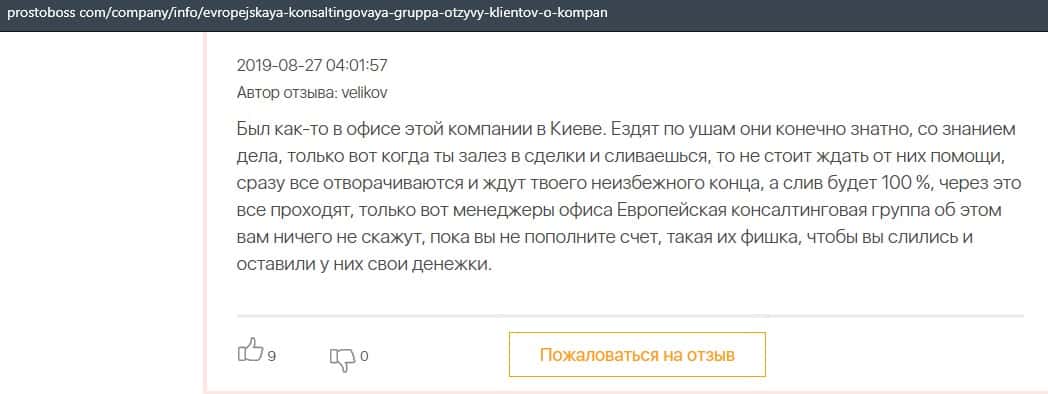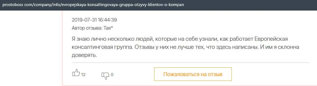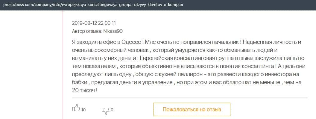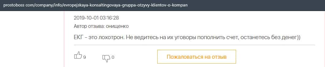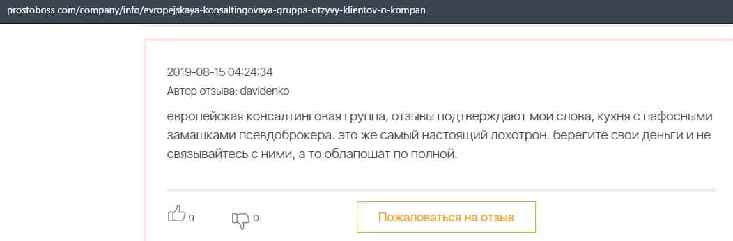 А в этом случае клиент конторы Европейская Консалтинговая Группа рассказал, что знакомый его потерял 5000 долларов, так как доверился уговорам разводил.