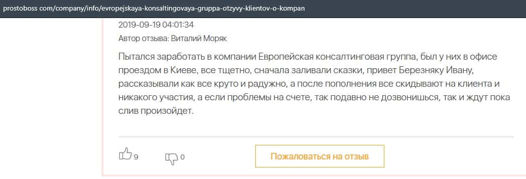 Клиент в своем отзыве рассказал, что лохотрон Европейская Консалтинговая Группа выманил у него порядка 6000 долларов и все было слито за короткий промежуток времени.