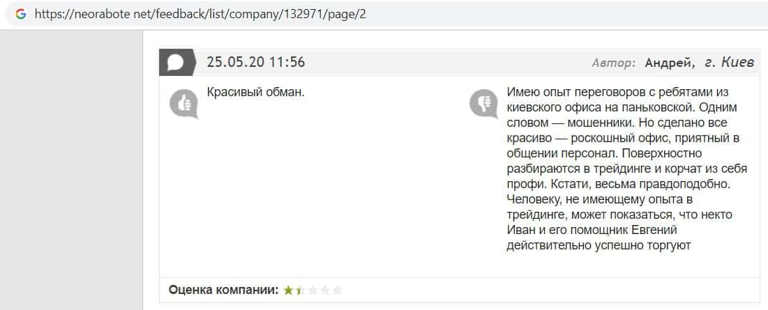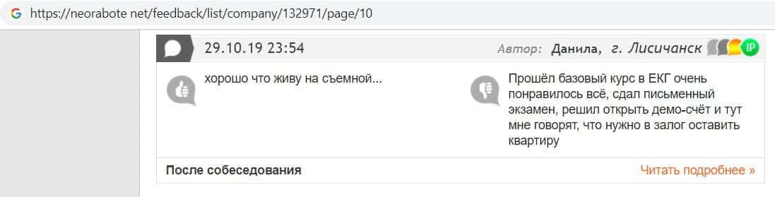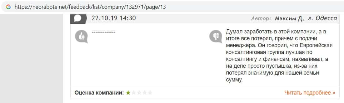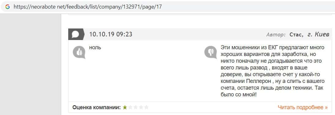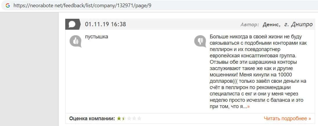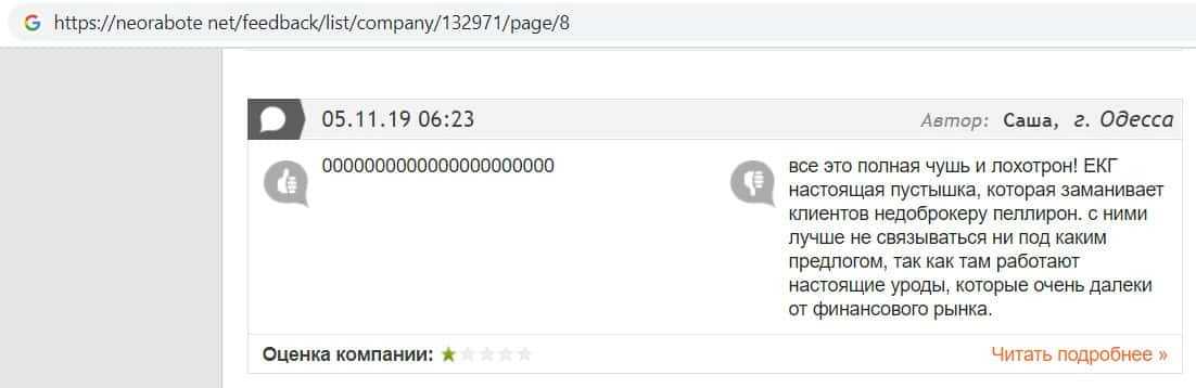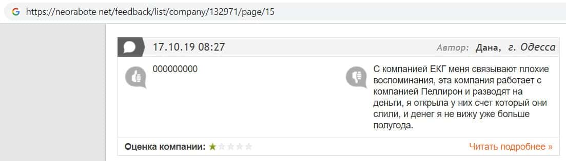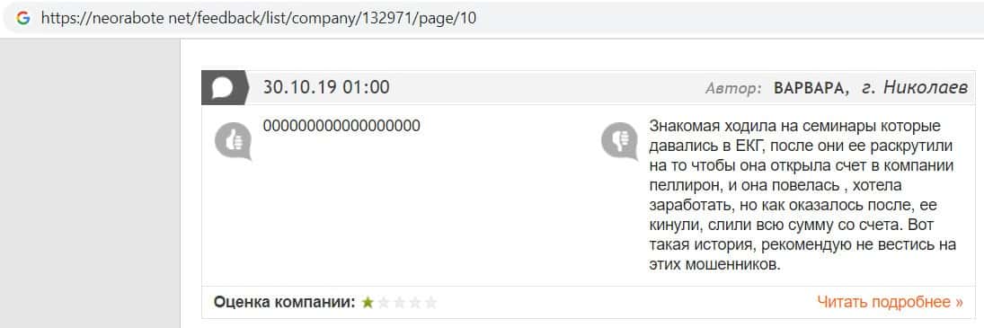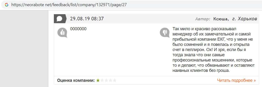 Человек в своем отзыве рассказал, как он попался на развод в конторе EC-Group Com Ua, так как мошенники работают на своих разводил из Пеллирон.