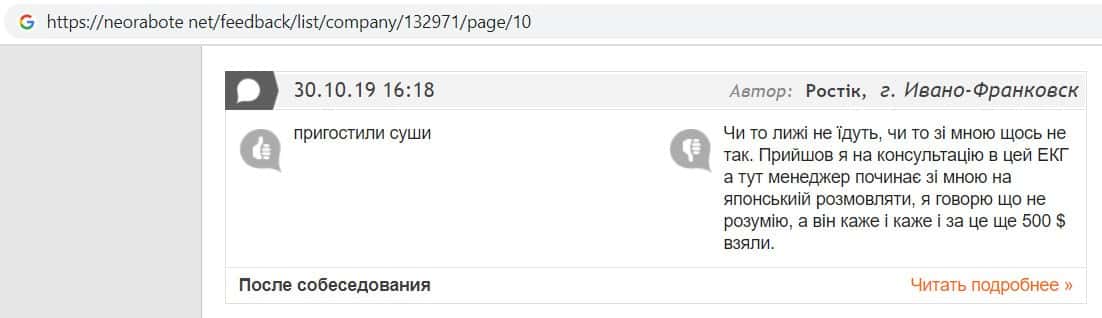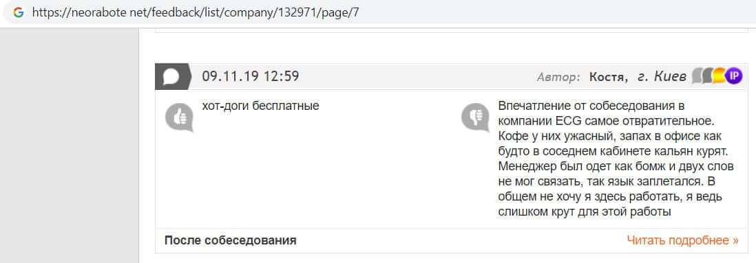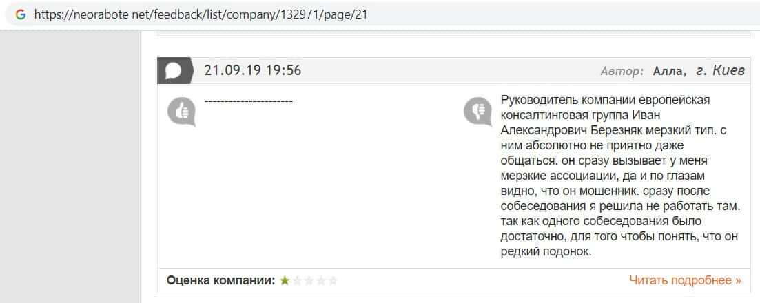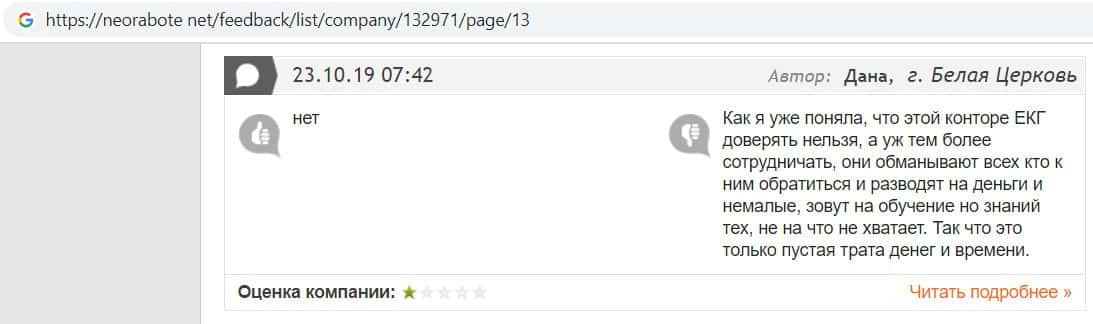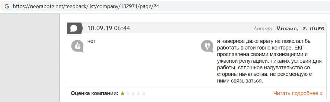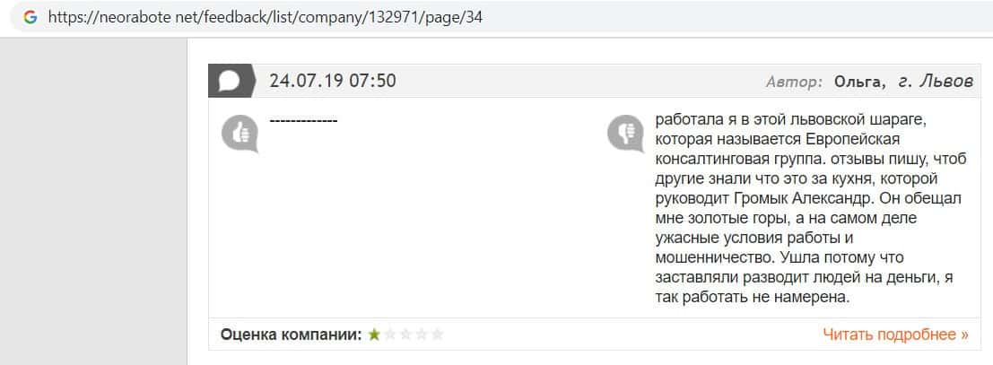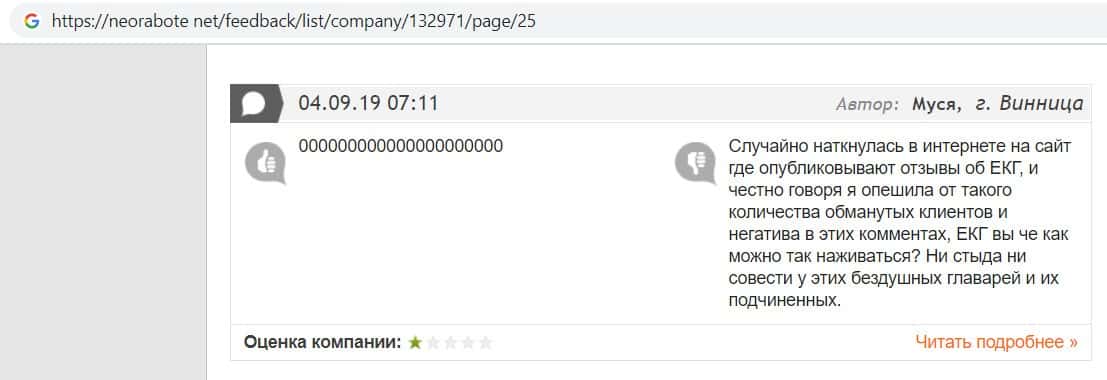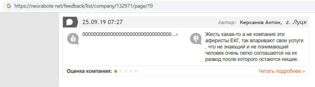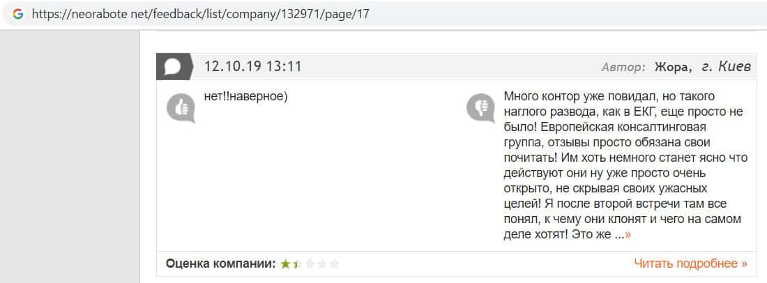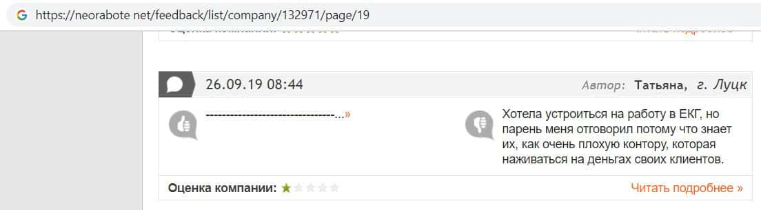 В данном отзыве пользователь написала, что хотела устроится в контору жуликов EC-Group Com Ua, но её отговорили, так как знают эту фирму и то как она разводит своих клиентов.