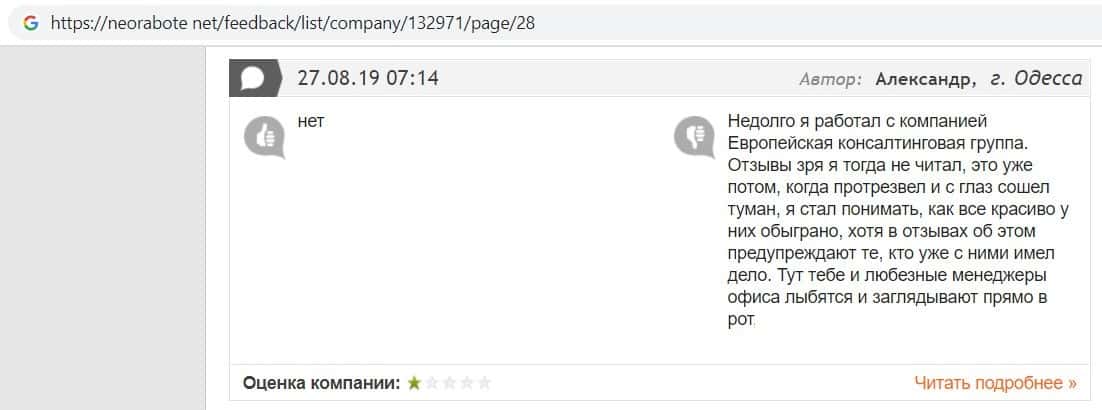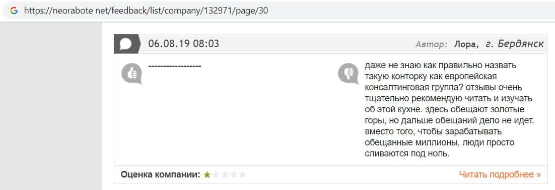 Один из пользователей посоветовал всем не сотрудничать с компанией Европейская Консалтинговая Группа, так как компания сливает всех своих клиентов самым наглым образом.