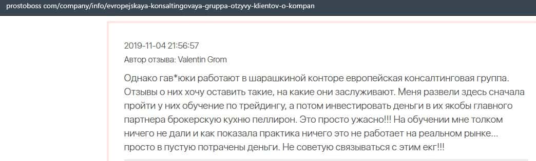 Шарага Европейская Консалтинговая Группа продвигает форекс-кухню Пеллирон и об этом сообщил еще один клиент, который на своей шкуре прочустсвовал весь этот развод.