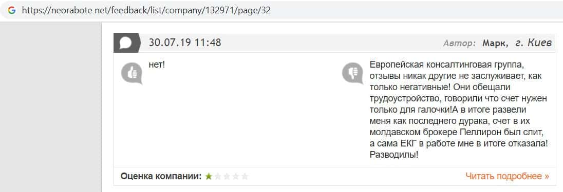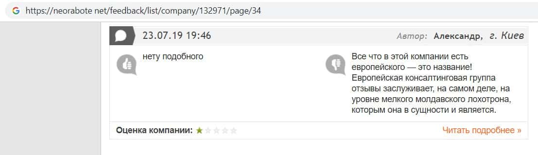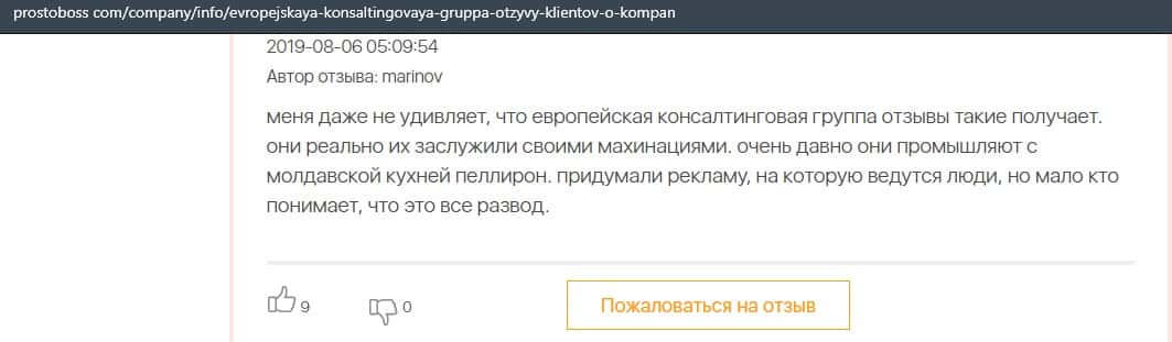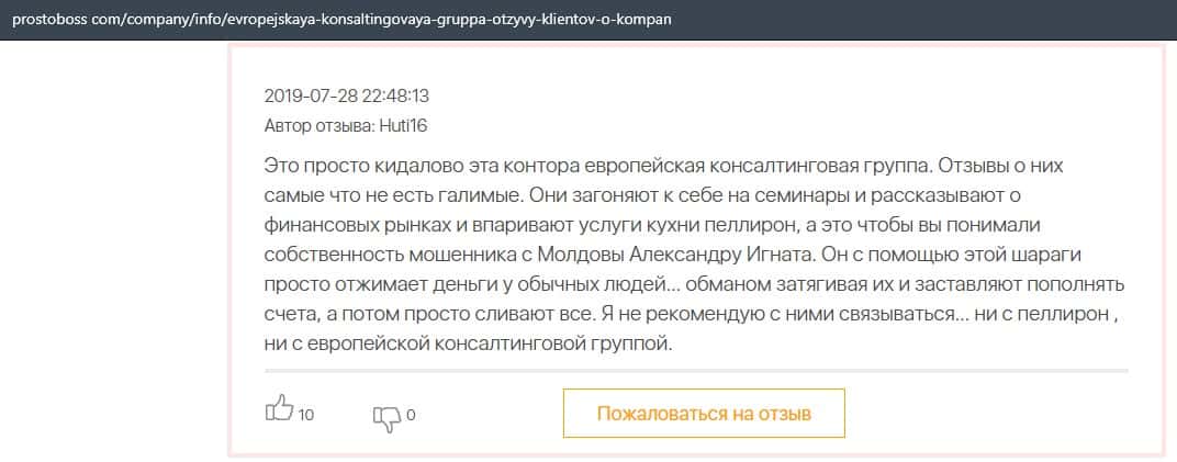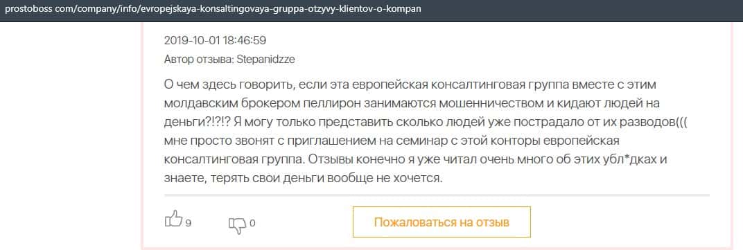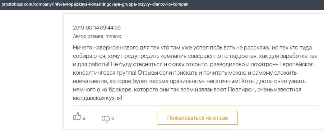 Еще один человек описал в своем отзыве что лохотрон Европейская Консалтинговая Группа имеет прямы связи с молдавским недоброкером Пеллирон.