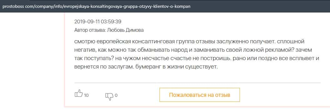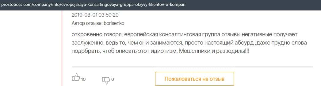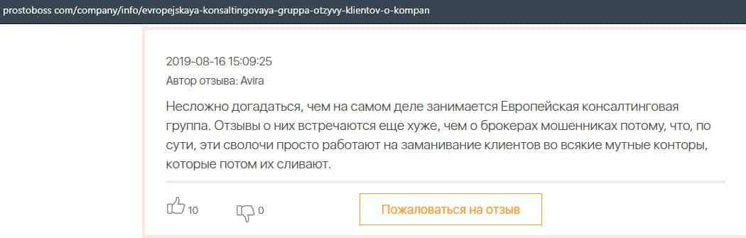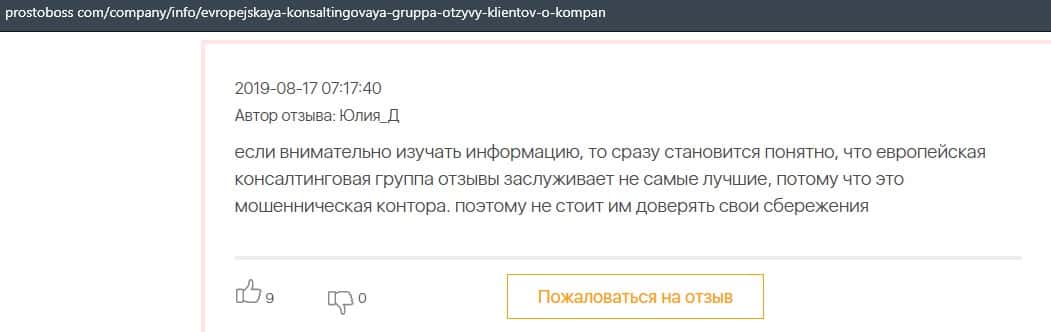 Контора Европейская Консалтинговая Группа заслуживает таких же негативных отзывов, как и лохотрон Пеллирон, который успел уже обворовать огромное количество людей.