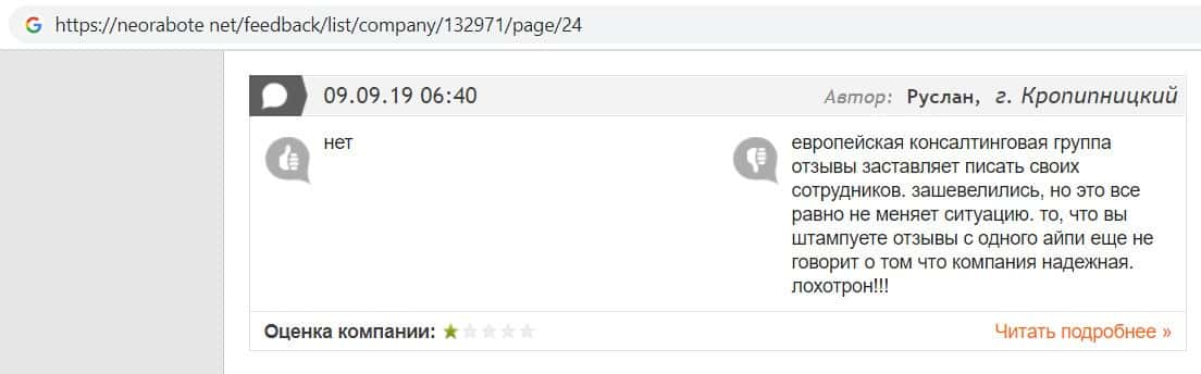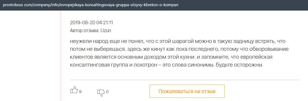 Пользователь утверждает, что Европейская Консалтинговая Группа - это мошенники, так как пользователь ощутил это на собственном опыте, и больше никому не советует эту фирму.