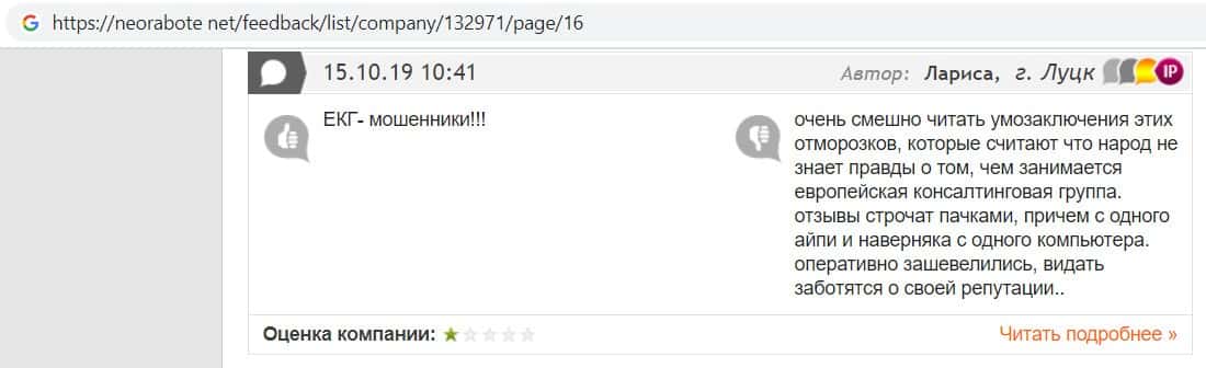 Ещё один пользователь заметил, что компания мошенников EC-Group Com Ua пишет отзывы сама о себе, так как все положительные отзывы написаны с одного айпи адреса.