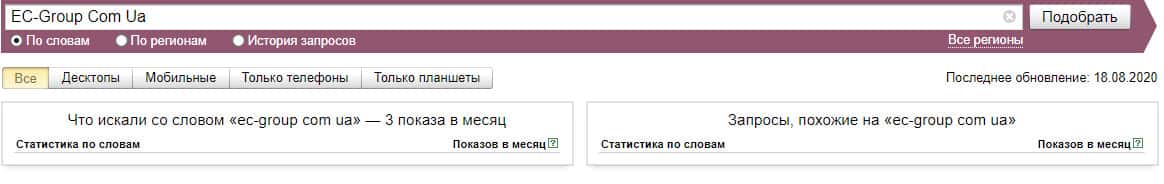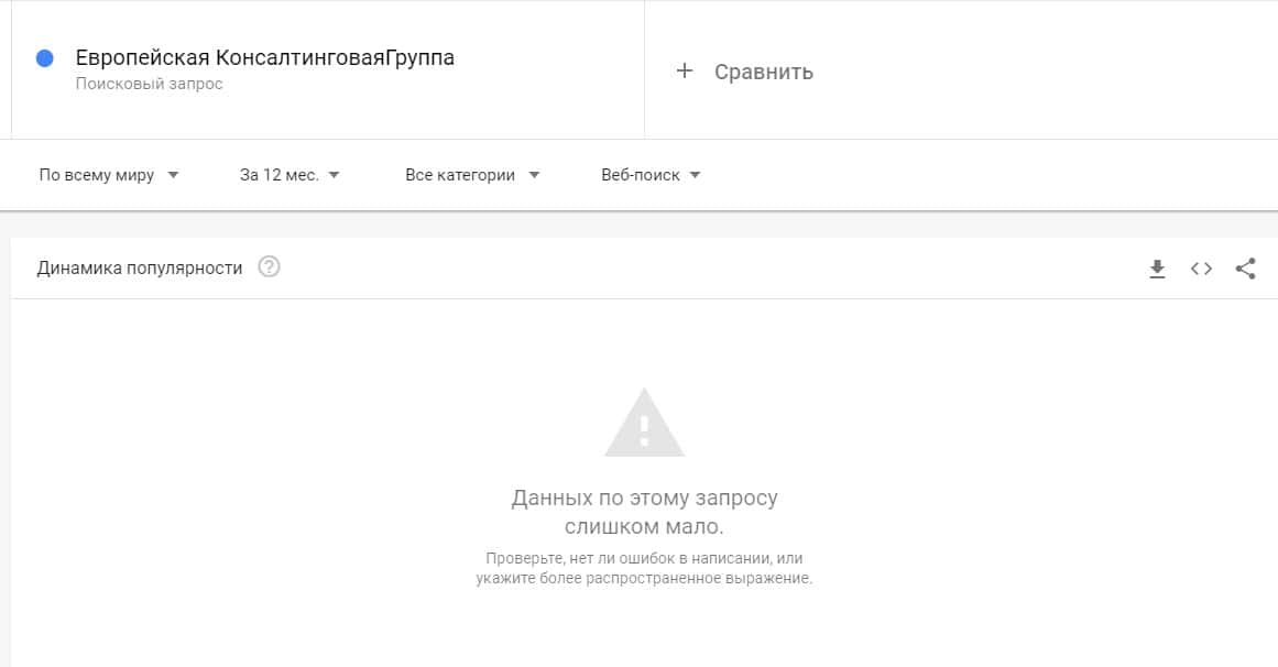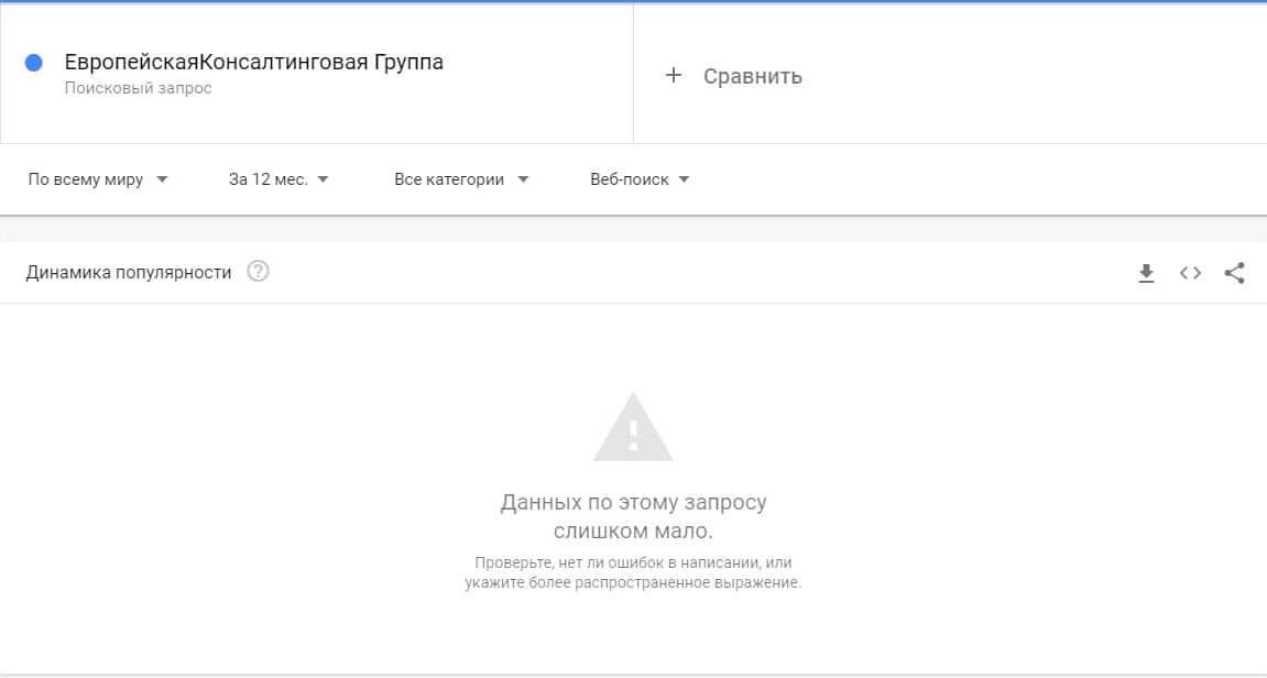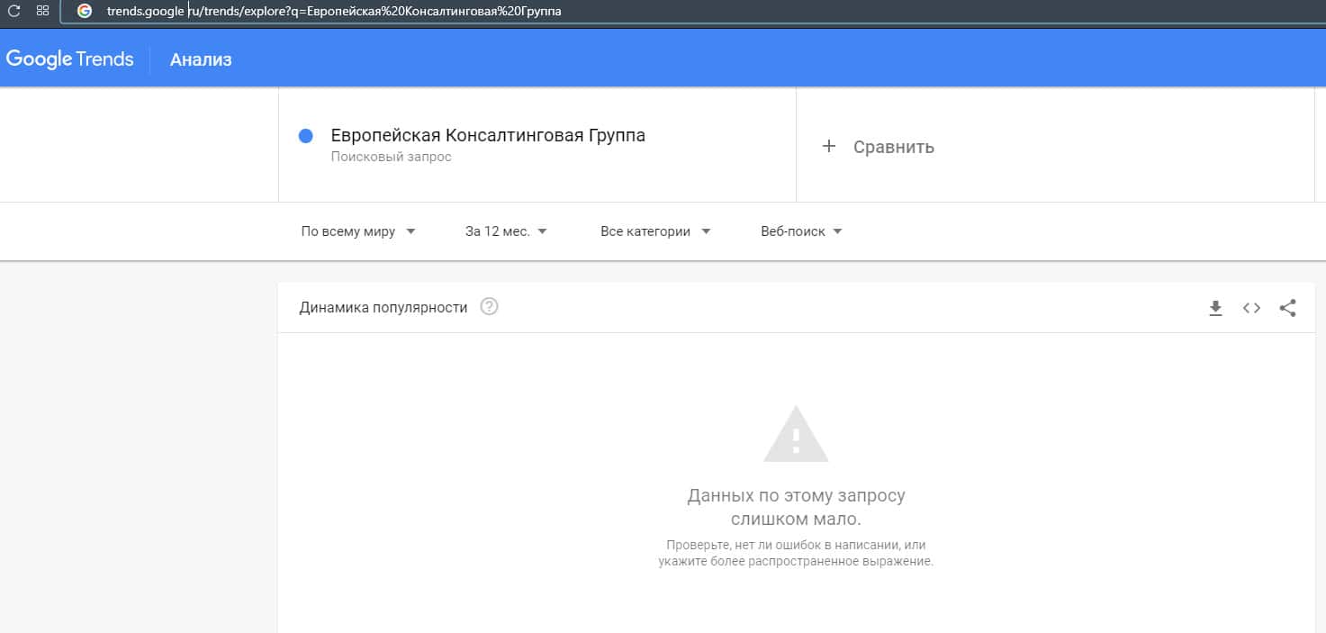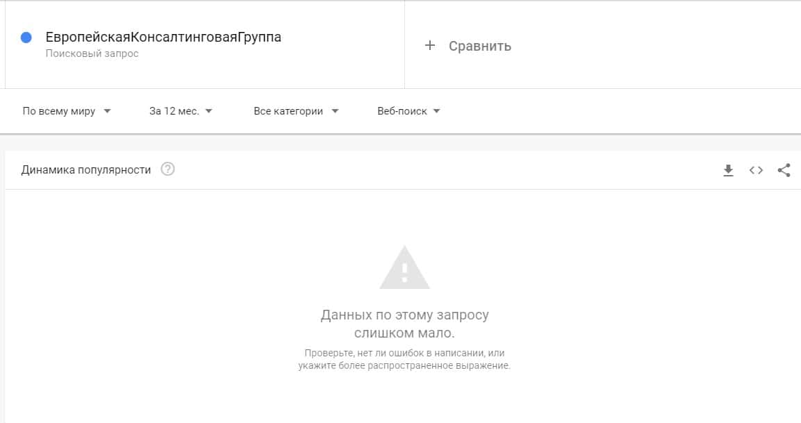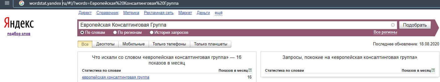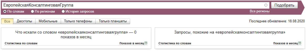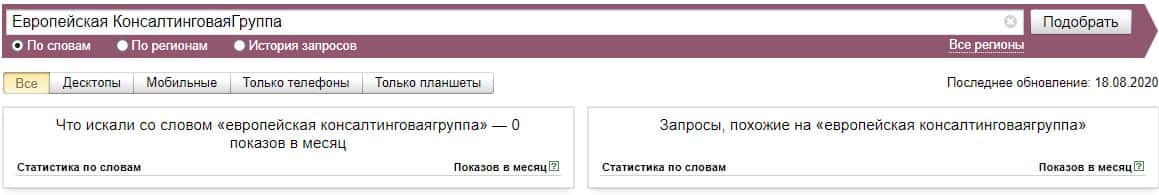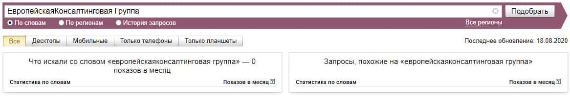 Тоже самое касается и другого бренда "ЕвропейскаяКонсалтинговаяГруппа", который также, по версии Яндекс.Вордстат не набрало показов вообще.