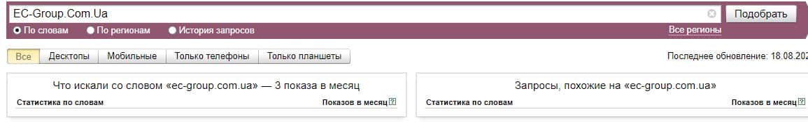 Согласно данным Яндекс.Вордстат, доменное имя "ec-group.com.ua" на котором размещен сайт лохотрона Европейская Консалтинговая Группа также было найдено 3 показов за месяц.