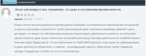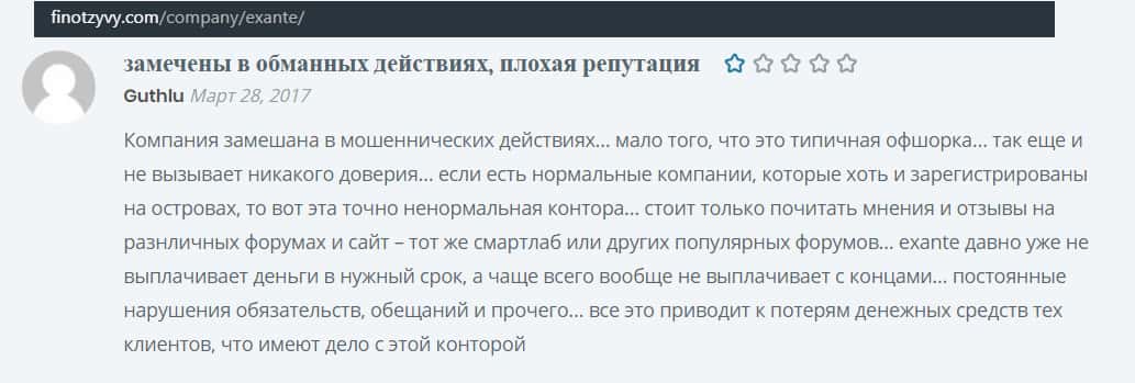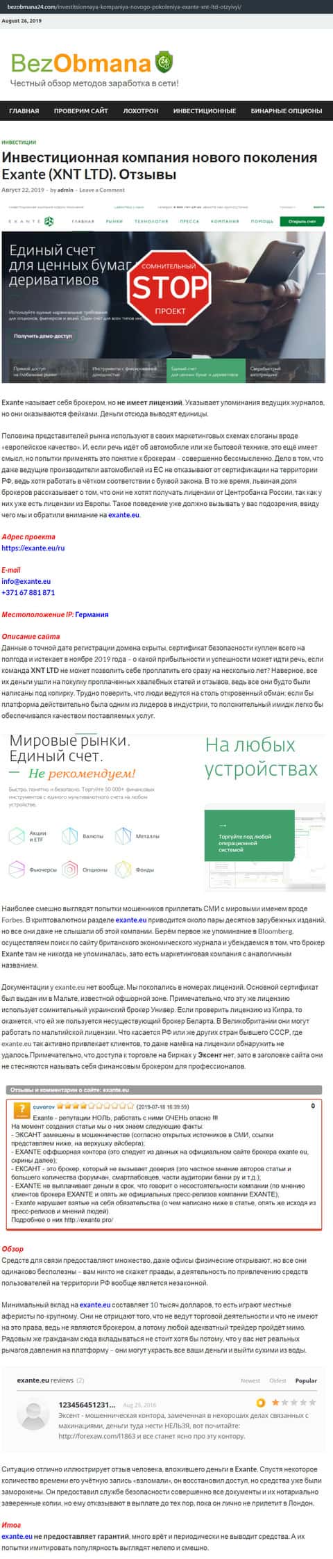 Следующий важный информационный материал о мошеннической компании Экзанте был найден на сайте bezobmana24 com, где также относят данный дилинговый центр к числу сомнительных инвест-проектов, потому как Exante - очередной мошенник на Форекс, который путем обмана вытаскивает деньги из карманов наивных онлайн-пользователей.