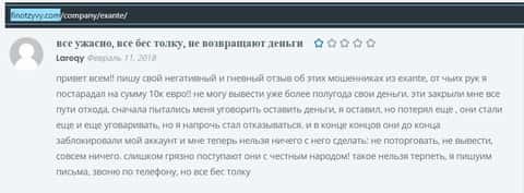 Далее опубликован комментарий клиента кухни Экзанте, который лишился в этом онлайн-лохотроне своих 10 000 евро. Человек столкнулся с явно мошенническими действиями в виде отказа в выводе депозита из организации Exante.